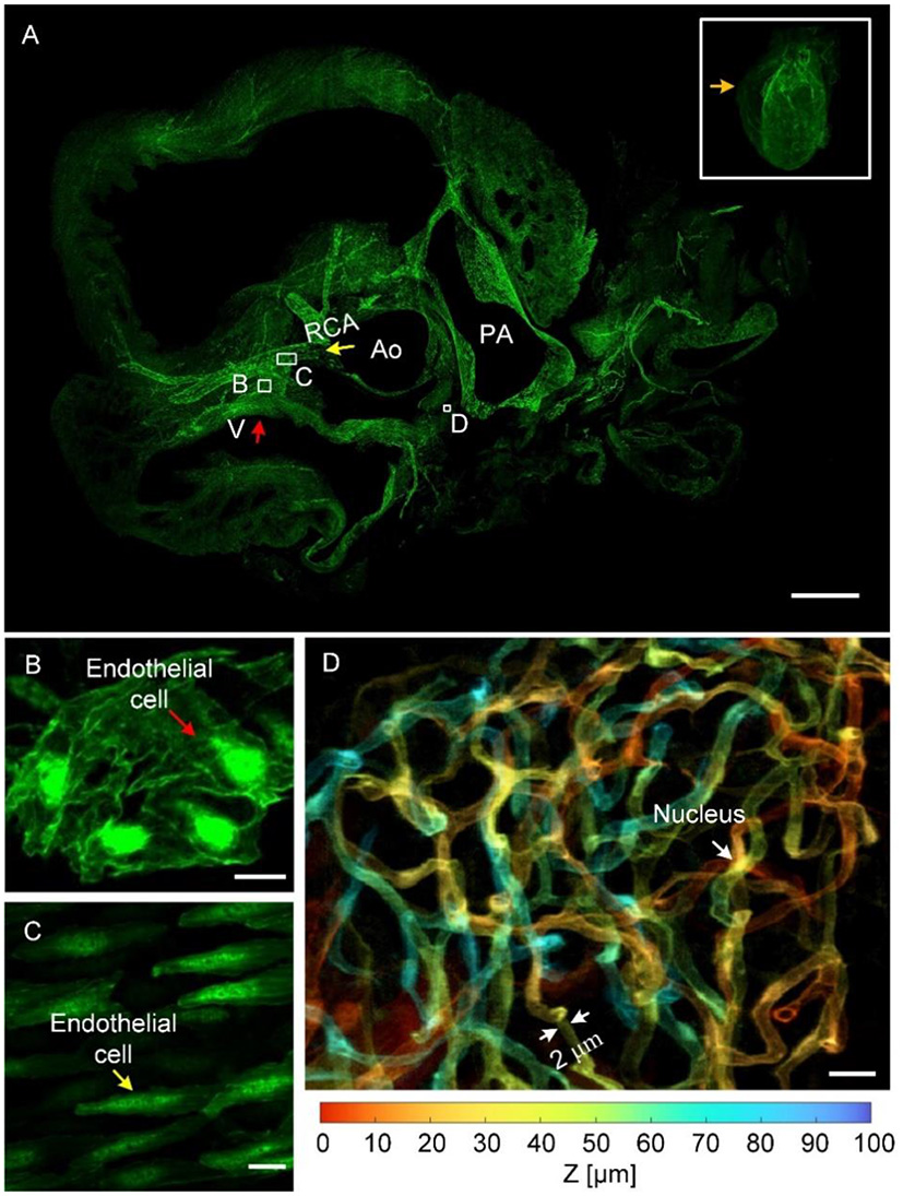 The heart is the key organ in the circulatory system responsible for pumping blood throughout the body. Myocardial and cardiovascular tissues are the main components of the heart and assist the heart in functioning properly. In particular, the cardiac vasculature is the main venue for the exchange of oxygen and carbon dioxide in the blood as well as nutrients and waste. Moreover, through the contraction, cardiomyocytes provide pressure for blood pumping. Thus, abnormalities in myocardial and vascular structures may affect the functions of the heart, causing cardiomyopathies and cardiovascular diseases (1). Atherosclerosis is a cardiovascular disease with high incidence and is characterized by thickening of the arterial wall (2). Previous studies have mainly focused on arterial abnormalities. However, less attention has been paid to capillaries that are involved in microcirculation and are critical in the cardiovascular system (3). Hence, the complete vasculature network should be visualized at the capillary level in cardiovascular disease studies. Hypertrophic cardiomyopathy has a typical pathology of myocyte disarray; however, the heart-wide distribution of such structural abnormalities is not completely clear (4). Therefore, imaging of the entire myocardium at the single-cell resolution can help locate lesions. Moreover, because both myocardial and vascular abnormalities are involved in some microcirculatory diseases, the interaction between the myocardium and intramyocardial vessels affects blood flow (5, 6). Thus, the simultaneous acquisition of myocardial and vascular images can reveal their spatial correlation (7). Heart-wide fine structures, especially the myocardium at the single-cell scale and the cardiac vasculature at the capillary level, must be examined in research on cardiac mechanisms and diseases.