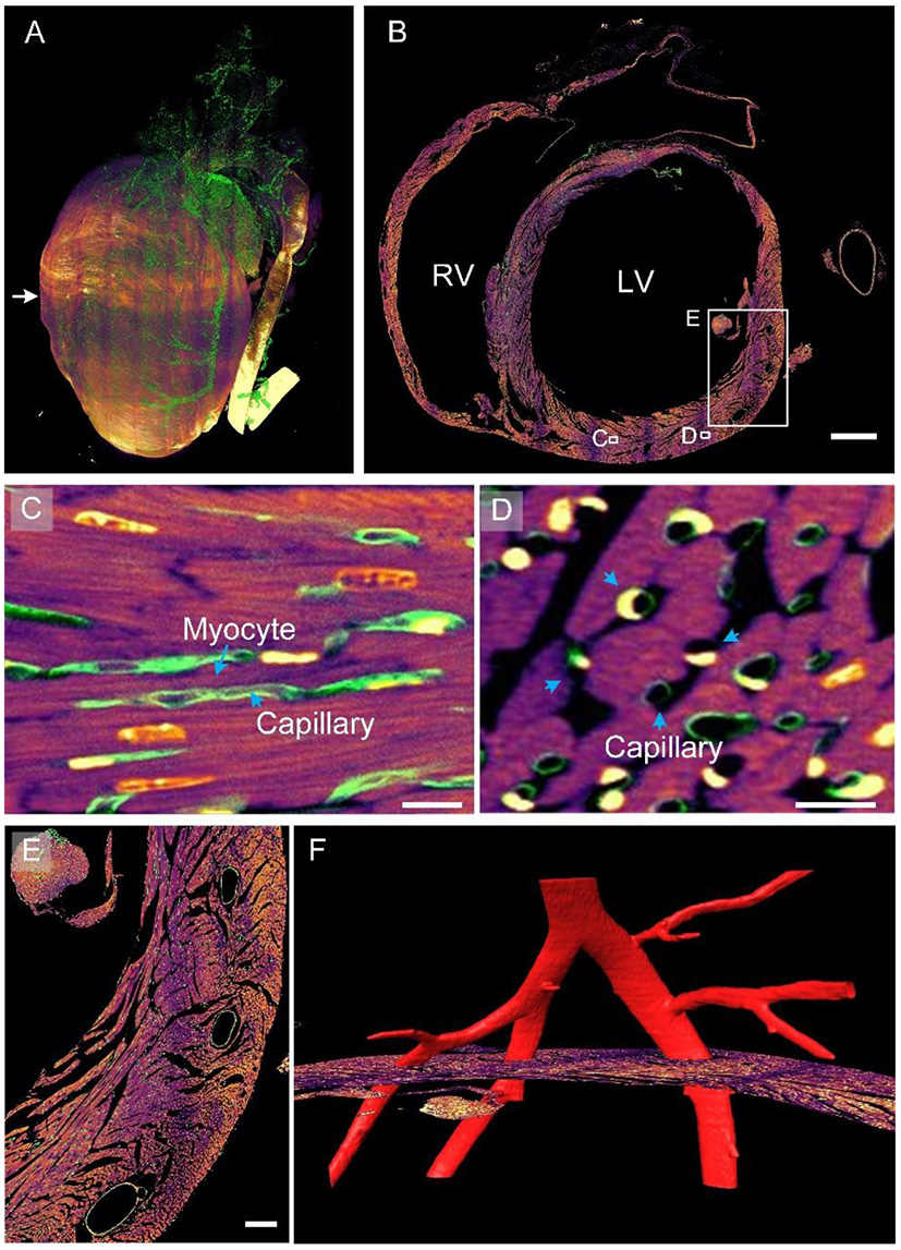 Myocardial and vascular data of the entire heart within a given mouse. (A) The 3D rendering of heart-wide myocardial and vascular data. The myocardial structure is in fuchsia and the vascular structure in green. (B) A selected axial section in the middle of the heart. LV, left ventricle; RV, right ventricle. Scale bar: 500 μm. (C,D) Enlarged views of corresponding white boxes in (B) revealing the spatial correlation between cardiomyocytes and capillaries. Scale bars: 10 μm. (E,F) Enlarged image of the white square in (B). Scale bar: 100 μm.