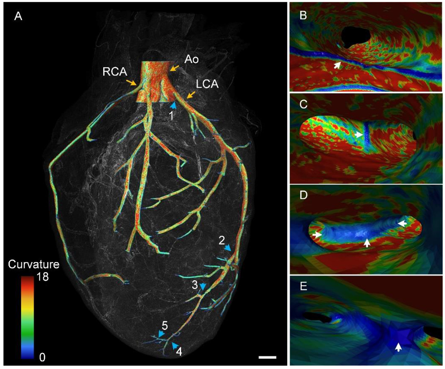 Color-coded vascular network based on the curvature of the vascular wall. (A) The 3D rendering of the reconstructed vascular network. Blue arrows point out five branches along the LCA. Ao, aorta; LCA, left coronary artery; RCA, right coronary artery. (B–E) Endoscopic perspective of corresponding branches 1–4 in (A) with colors representing the curvature difference. (B) is the division of the Ao and LCA.