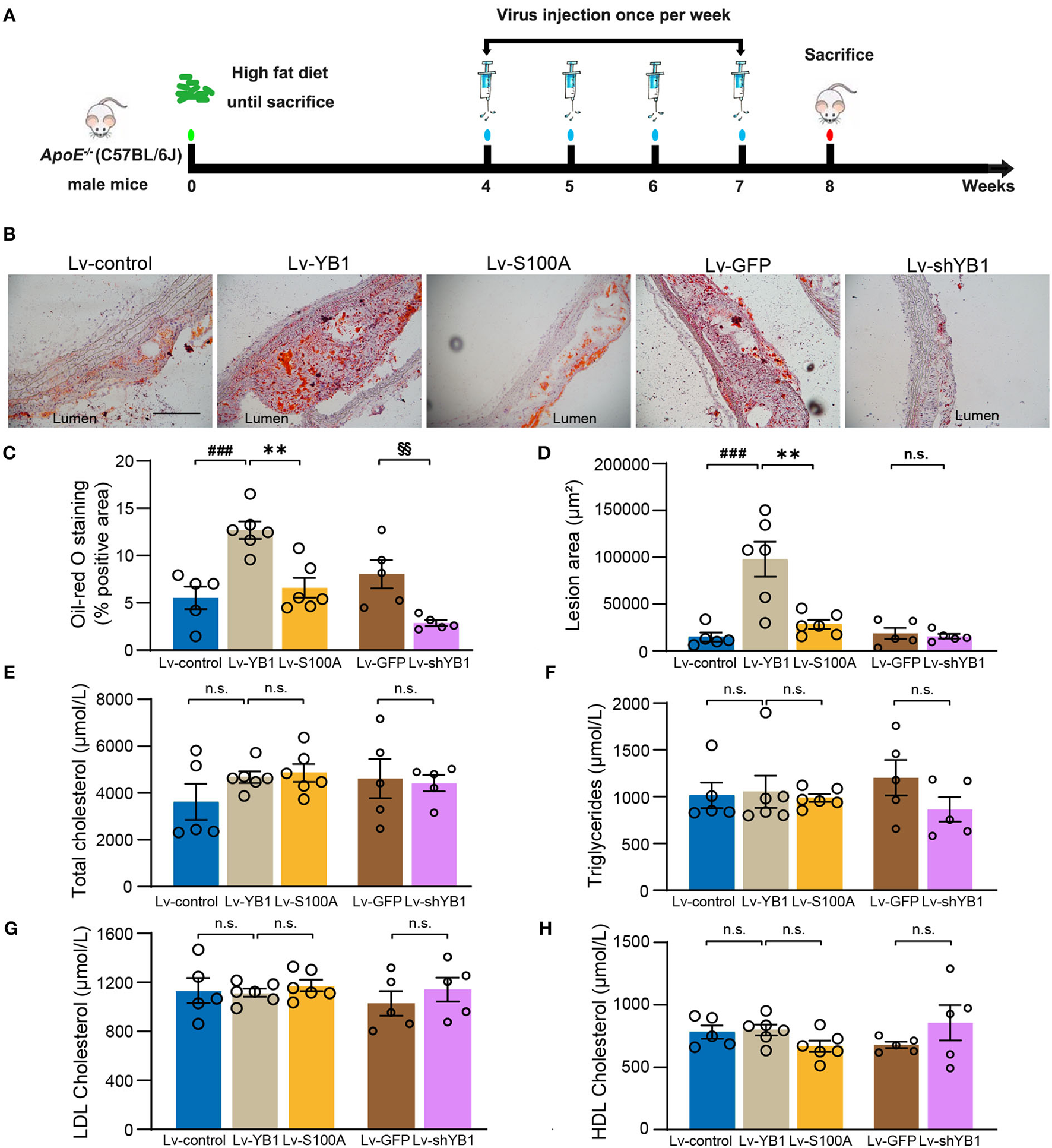 A total of 27 male ApoE−/− (C57BL/6J) mice aged 8 weeks old were purchased from Vital River Laboratory Animal Technology Co. Ltd. (Beijing, China), and maintained at a constant temperature of 23°C and humidity of 55% under specific-pathogen-free (SPF) conditions. Mice were fed a high-fat diet (HFD) until sacrifice. At the age of 12 weeks, mice were randomly divided into five groups accompanied by lentiviral infection via tail vein injection. Mice from Lv-control group (n = 5) and Lv-GFP (n = 5) were treated as empty vector expression controls, mice from Lv-YB1 group (n = 6) and Lv-S100A group (n = 6) were treated as YB1 over-expression and phosphorylation site mutant (Ser-100), mice from Lv-shYB1 group (n = 5) were treated as YB1 knockdown.