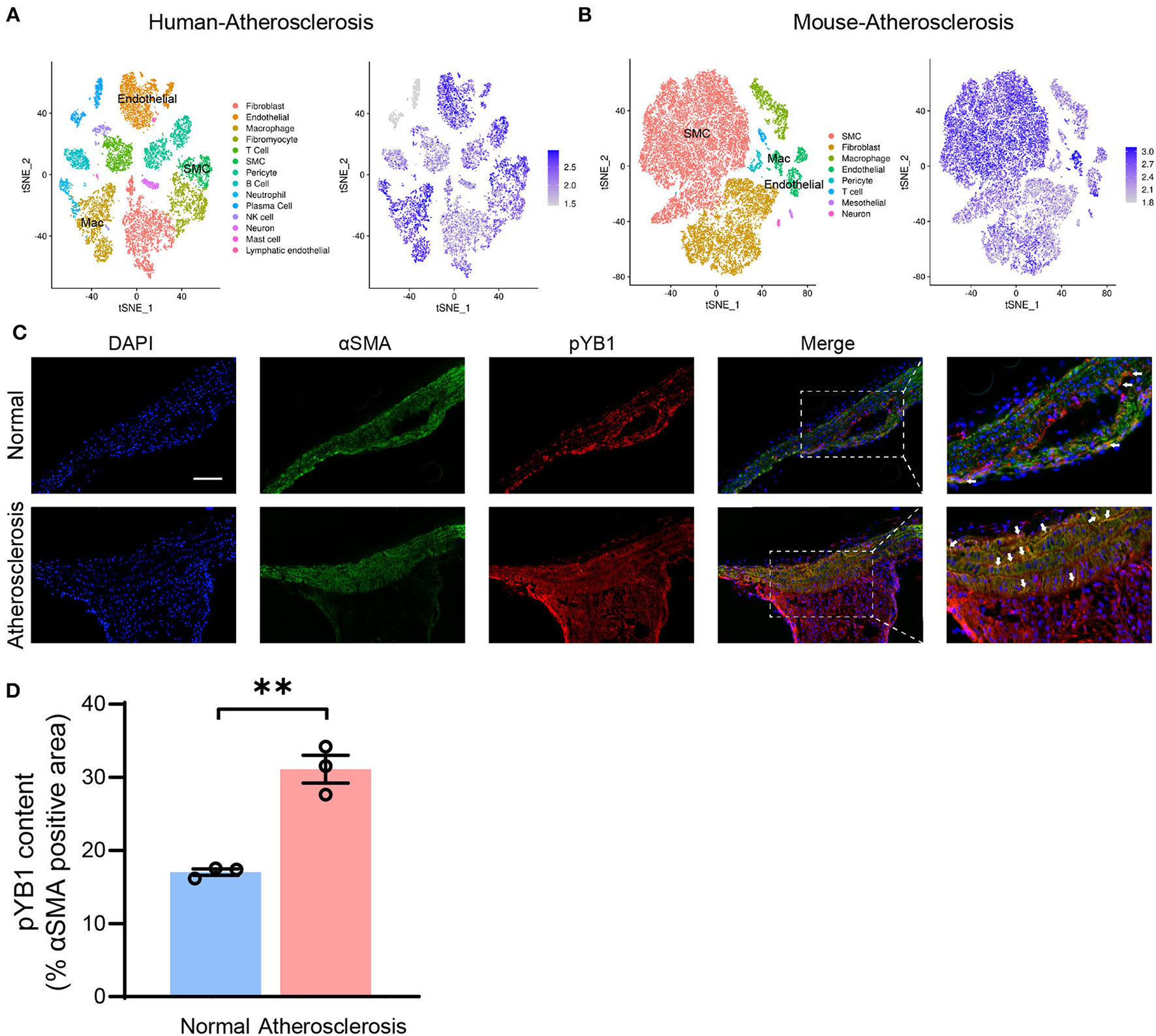Phosphorylated YB1 was elevated in smooth muscle cells in atherosclerotic mice. (A) t-stochastic neighbor embedding (t-SNE) visualization of cell types present in human atherosclerosis aortic tissue (left), and the expression of the gene YBX1 (encodes YB1, right). (B) t-SNE visualization of cell types present in mouse atherosclerosis aortic tissue (left), and the expression of YB1 (right). (C) Representative images of immunofluorescent co-staining of αSMA and pYB1 in aortic arches, and the related quantitative analysis (D). Abbreviations in (A) SMC, smooth muscle cell; Mac, macrophage. Data are presented as the mean ± SEM. Student's two-tailed t-test. **P < 0.01 vs. Normal, Scale bar = 100 μm (n = 3–5 for each group).