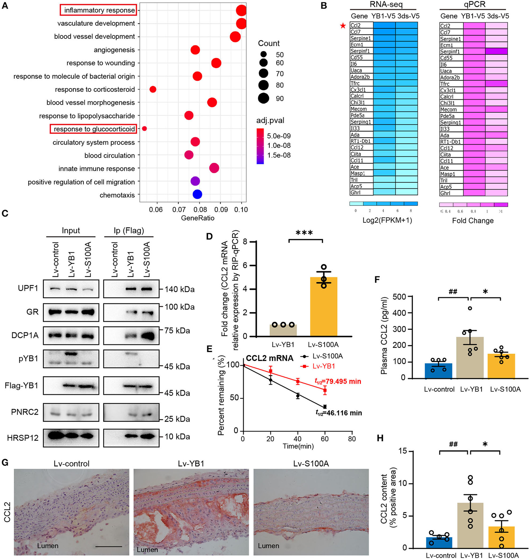 YB1 dephosphorylation decreased CCL2 expression by promoting mRNA decay in SMCs. (A) Top 15 enriched Gene Ontology using DEGs between the YB-1-V5 and 3dS-V5 group; (B) Heatmap showing the expression of representative inflammatory-related genes in YB-1-V5 and 3dS-V5 group in the RNA-seq data and its validation by RT-qPCR, respectively. (C) Flag-tagged YB1 was immunoprecipitated using Flag M2 beads and subjected to the Western blot for the determination of the GMD (glucocorticoid receptor-mediated mRNA decay) complex. (D) Flag-tagged YB1 RIP followed by qPCR (RIP-qPCR) analysis between the Lv-YB1 and Lv-S100A group. (E) The half-live of CCL2 was decreased in the Lv-S100A group compared with the Lv-YB1 group. (F) Plasma CCL2 of ApoE−/− mice from Lv-control, Lv-YB1, Lv-S100A group. (G) Representative images of immunohistochemical staining of CCL2 in the mouse aortic arch from Lv-control, Lv-YB1, and Lv-S100A groups, and the related quantitative analysis, respectively (H). Data are presented as the mean ± SEM. Statistics (D): Student's two-tailed t-test, (F,H): One-way ANOVA. ##P < 0.01 vs Lv-control, *P < 0.05, ***P < 0.001 vs. Lv-YB1. Scale bar = 50 μm (n = 3 to 6 for each group).