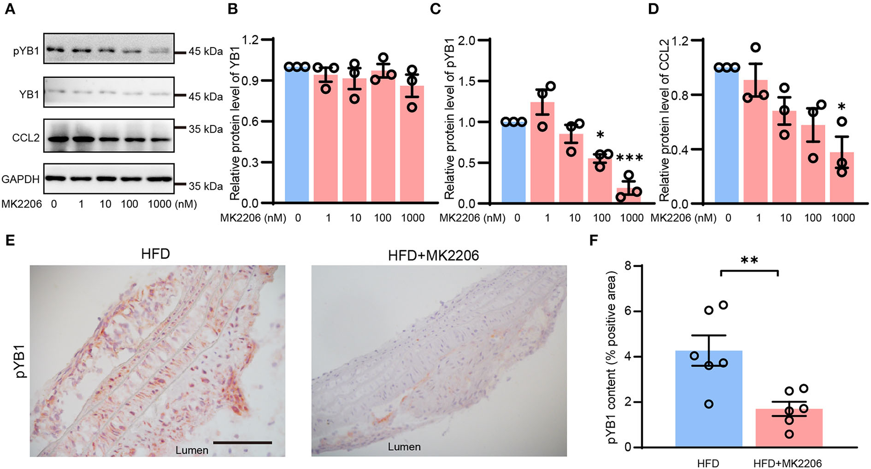 MK2206 inhibited YB1 dephosphorylation and decreased CCL2 expression. Representative immunoblot images (A) and quantification of YB1 (B), pYB1 (C), and CCL2 (D) in VSMCs treated with MK2206 in a dose-dependent manner for 24 h. (E) Representative images of immunohistochemical staining of CCL2 in the mouse aortic arch from HFD and HFD + MK2206 group, and the related quantitative analysis (F). Data are presented as the mean ± SEM. Student's two-tailed t-test. *P < 0.05, **P < 0.01, ***P < 0.001 vs. 0 nM group or HFD group. Scale bar = 50 μm (n = 3 to 6 for each group).