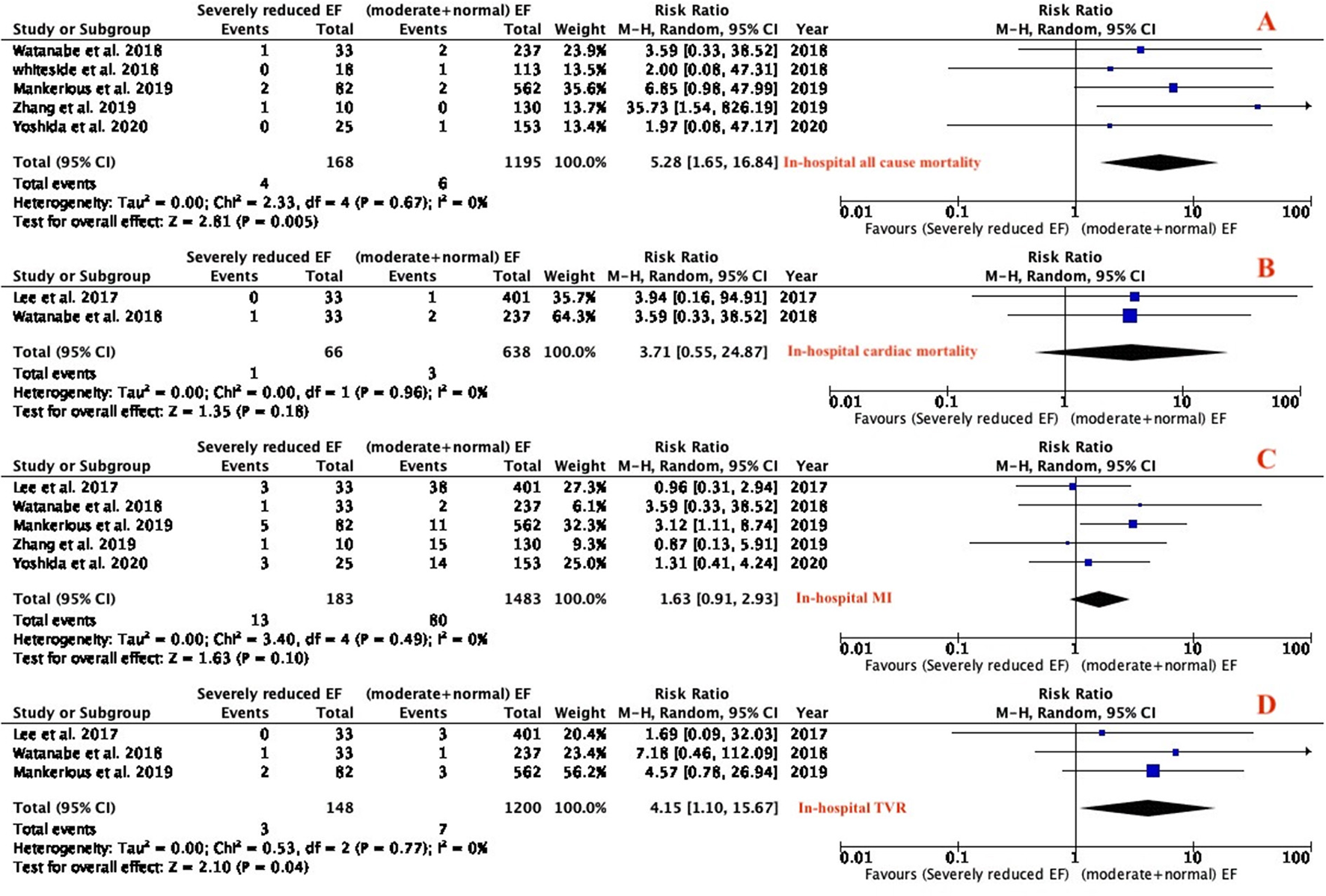 A total of 7 studies consisting of 2,238 unique patients were included in the analysis. The median follow-up duration was 22.4 months. The risk of in-hospital all-cause mortality using atherectomy in patients with severely reduced LVEF compared to the patients with moderate reduced or preserved LVEF was [2.4vs.0.5%; RR:5.28; 95%CI 1.65–16.84; P = 0.005], the risk of long term all-cause mortality was [21 vs. 8.8%; RR of 2.84; 95% CI 1.16–6.95; P = 0.02]. In-hospital TVR risk was 2.0 vs. 0.6% (RR: 4.15; 95% CI 4.15–15.67; P = 0.04) and long-term TVR was [6.0 vs. 9.9%; RR of 0.75; 95% CI 0.39–1.42; P = 0.37]. In-hospital MI was [7.1 vs. 5.4%; RR 1.63; 95% CI 0.91–2.93; P = 0.10], long-term MI was [7.5 vs. 5.7; RR 1.74; 95%CI 0.95–3.18; P = 0.07).