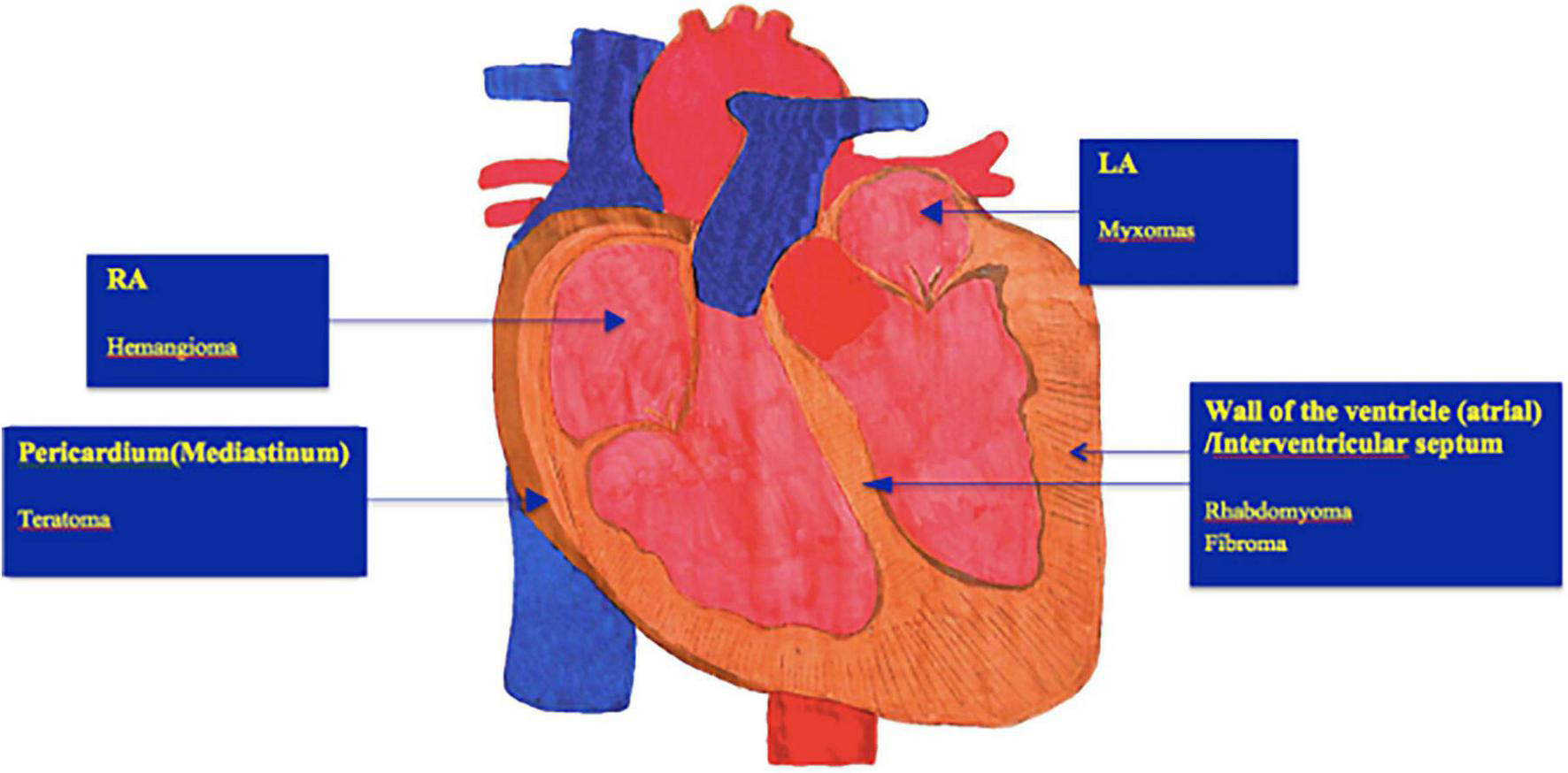 Children with cardiac tumors can be consists of non-specific symptoms-just like fever, and anemia, which make the diagnosis challenging, or present with a variety of clinical traits depending on the tumors’ size, localization, and pace of growth (9, 10). The clinical presentation generally does not depend on the histopathology of the tumor, so there was no significant difference in mass effect between benign and malignant cardiac tumors. Tumors can occur in the myocardium, atrium (chamber) cavity, and heart valve. When the tumor is small, there may be no apparent symptoms; when the tumor is massive, the obstruction is severe and narrowing of the cardiac chamber. The extensive tumor infiltration into the ventricular wall will decrease the effective myocardial beat, resulting in weakened cardiac systolic and diastolic functions. Arrhythmias may occur when tumors involve the conduction system, including premature beats, supraventricular tachycardia, pre-excitation syndrome, bundle branch block, etc.; Among these, atrioventricular block and ventricular tachycardia are not uncommon and may even be related to sudden death. When the tumor is located around the biventricular inflow (outlet) tract, it may cause obstruction, and the blood flow velocity increases at the location of the obstruction, resulting in a heart murmur. Atrial mass is more likely to block the flow of atrioventricular blood flow than ventricular mass, similar to valve stenosis, and ventricular mass blocking the outflow tract may lead to chest pain, dyspnea, and syncope. In addition, tumor infiltration of surrounding organs or tissues may cause the corresponding dysfunction. It should be emphasized that cardiac myxomas that easily dislodge fragments in older patients may cause multi-organ embolism (11–13). The possible clinical manifestations of each tumor will be discussed in detail.