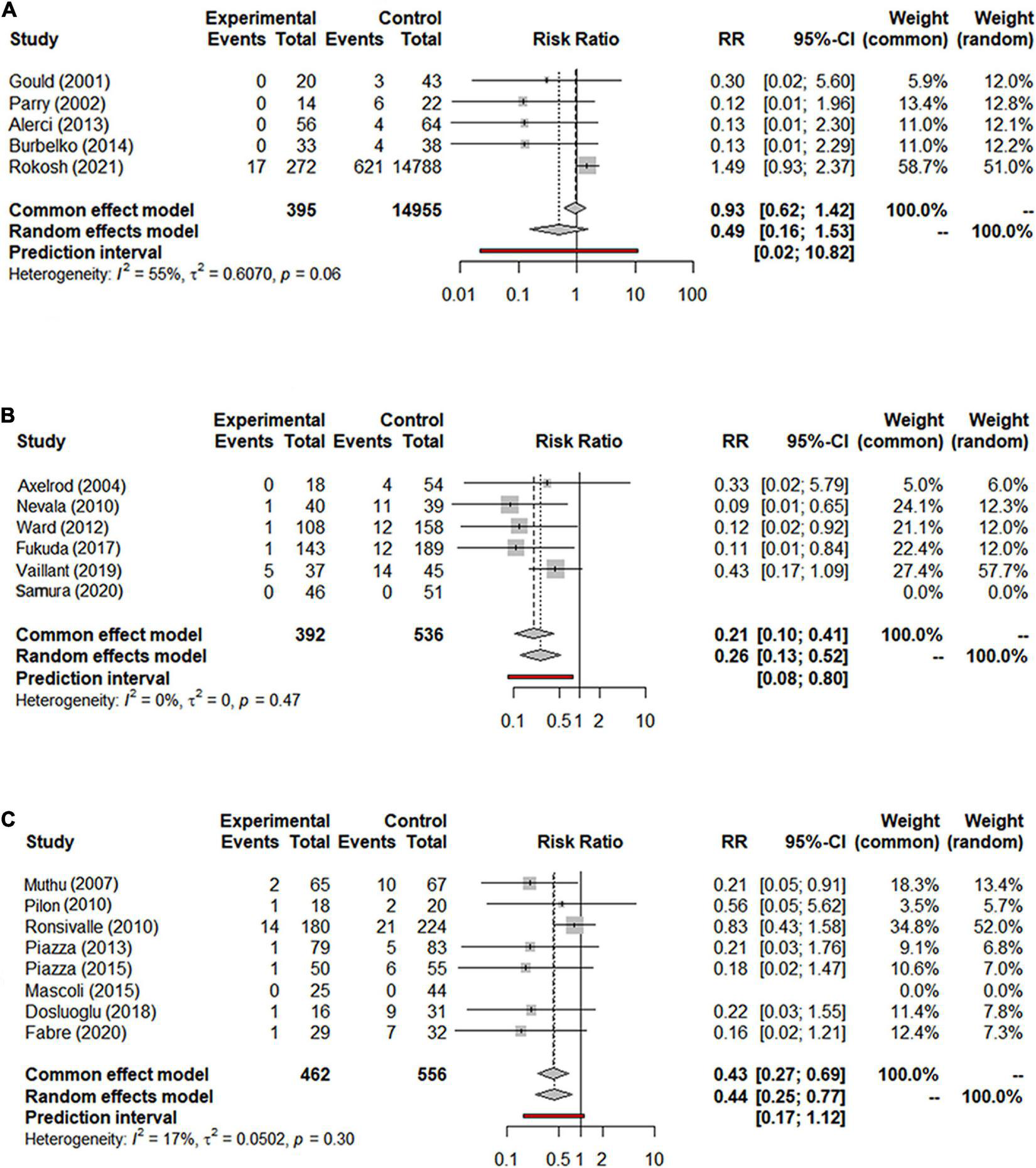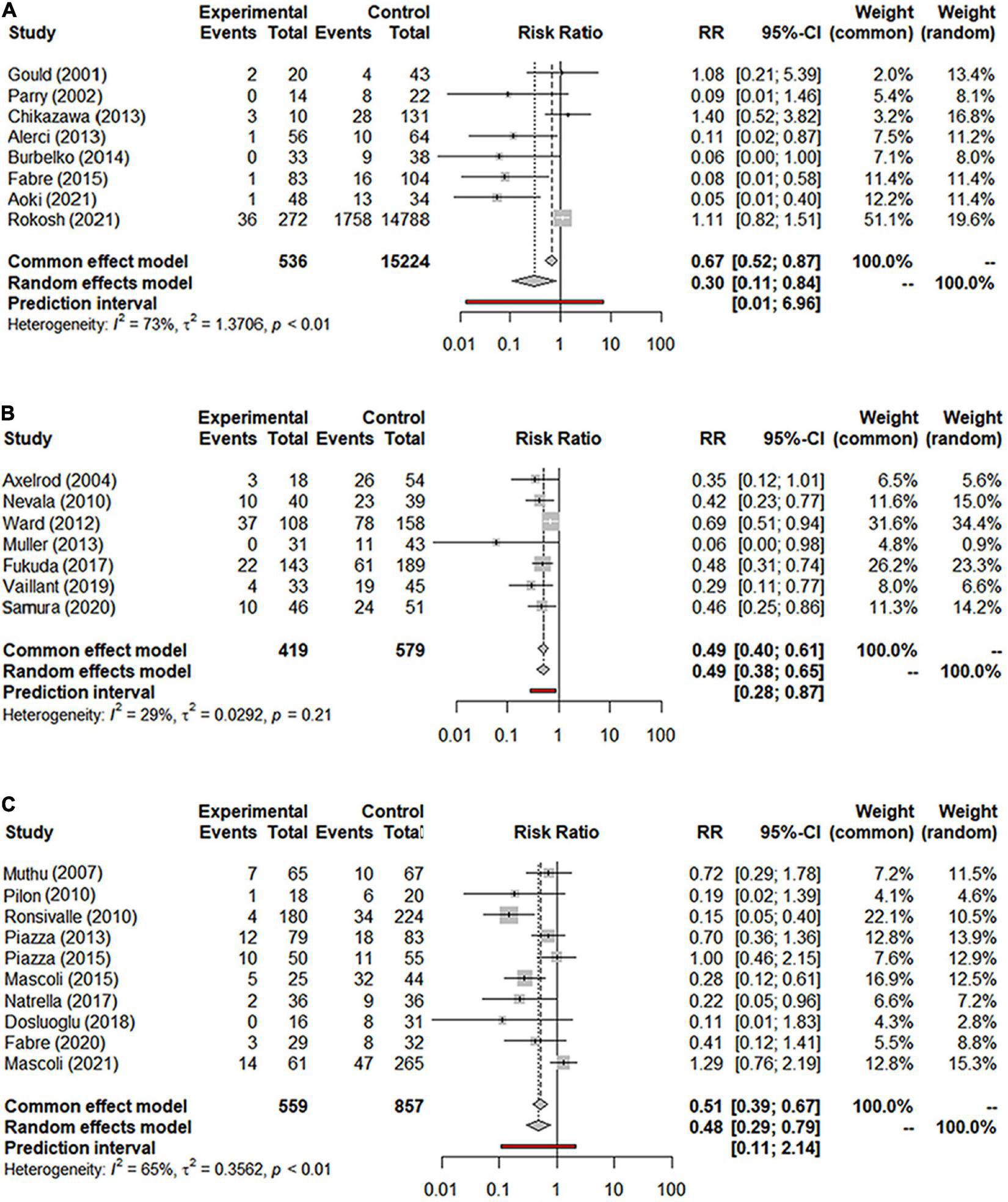 (A) Forest graph of T2EL in NS-ASSB group (RR 0.30 95% Cl 0.11–0.84); (B) forest graph of T2EL in IMA-ASSB group (RR 0.49 95% Cl 0.38–0.65); (C) forest graph of T2EL in ASCE group (RR 0.48 95% Cl 0.29–0.79). NS-ASSB, non-selective embolization of aneurysm sac side branches; IMA-ASSB, embolization of the inferior mesenteric artery; ASCE: aneurysm sac coil embolization.