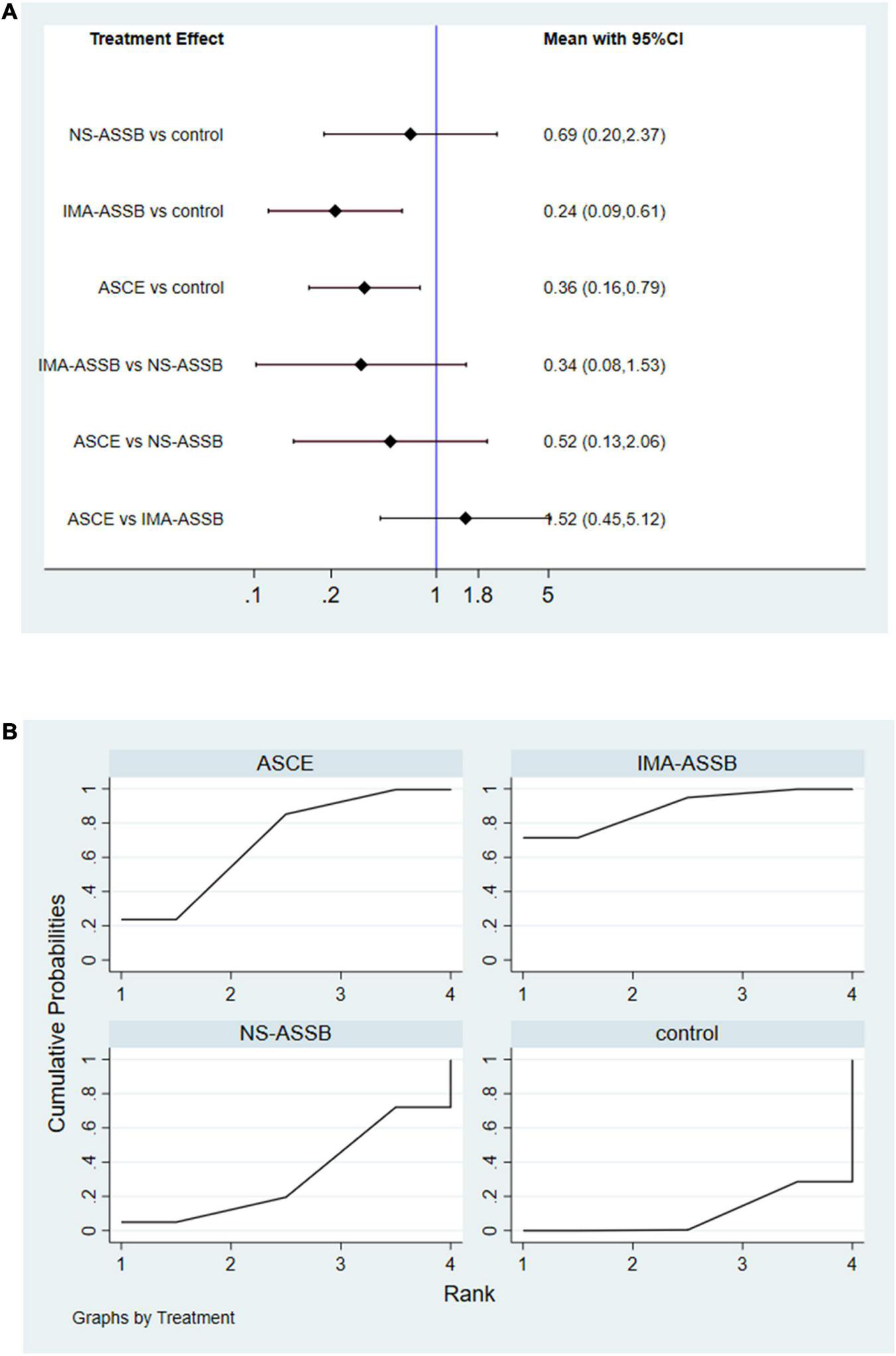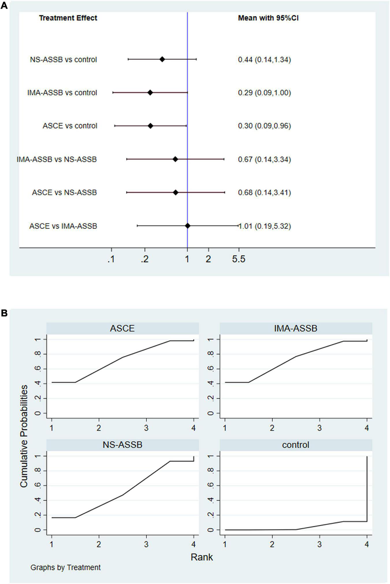 (A) Network meta-analysis forest graph of T2EL in NS-ASSB, IMA-ASSB and ASCE groups; (B) SUCRA curve of T2ELin NS-ASSB, IMA-ASSB and ASCE groups; NS-ASSB, non-selective embolization of aneurysm sac side branches; IMA-ASSB, embolization of the inferior mesenteric artery; ASCE, aneurysm sac coil embolization.