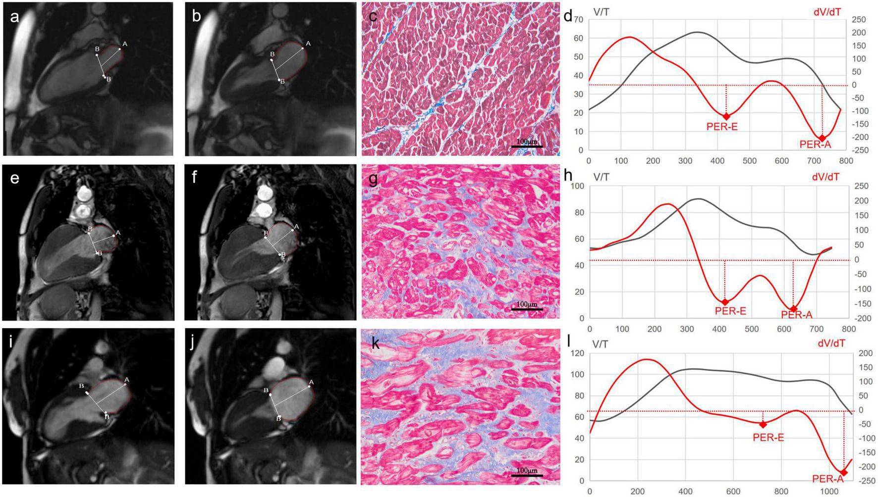 Cardiac magnetic resonance (CMR) images of left atrial (LA) and histological images of myocardium from a control subject (the top panel), a male patient with hypertrophic obstructive cardiomyopathy (HOCM) (the middle panel), and a female patient with HOCM (the bottom panel). The first column is CMR images of the minimum LA volume after atrial contraction in the two-chambered view (Control: a, Male: e, Female: i). The second column is CMR images of the maximal LA volume before the mitral valve opening in the two-chambered view (Control: b, Male: f, Female: j). The third column is the images of myocardial fibrosis (blue) stained with Masson’s trichrome (Control: c, Male: g, Female: k). The fourth column is volume-time curves (black) and their first derivatives (red) of the left atrium (Control: d, Male: h, Female: l). LA V/T curves after the first peak and dV/dt curves under the coordinate axis represent the process of LA emptying. The first negative peak, representing maximal emptying during the conduit phase, is identified as the early atrial peak emptying rate (PER-E). The second peak, during the booster phase, is identified as the late atrial peak emptying rate (PER-A).