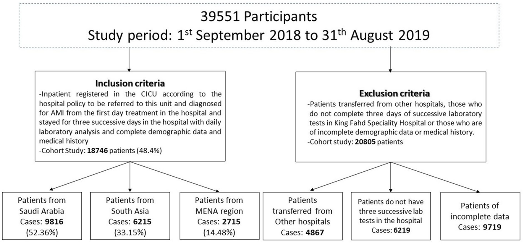 Among 39,551 patients admitted to the Coronary Intensive Care Unit (CICU) at King Fahd Speciality hospital in the Tabuk region during the period from September 2018 to August 2019, 18,746 patients admitted with a diagnosis of acute myocardial infarction (AMI) were included in the study (about 48.4%) (Figure 1).