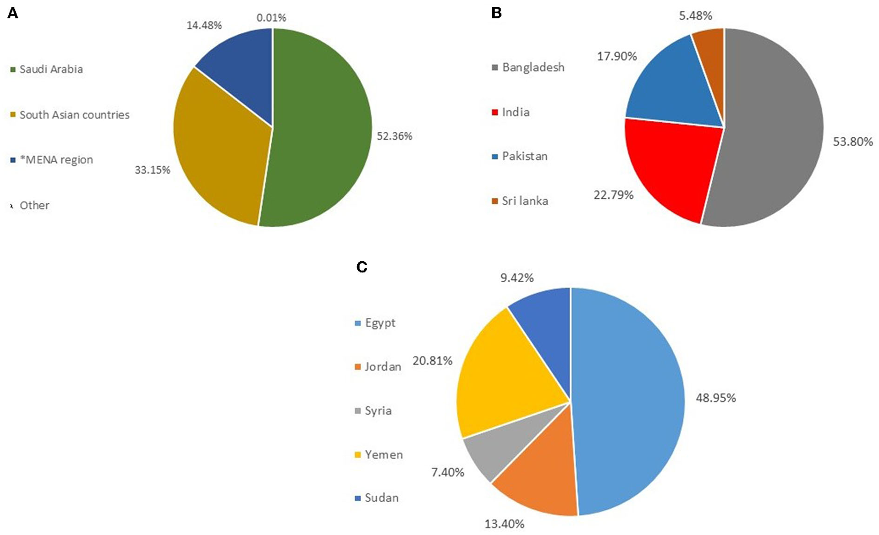 Distribution of nationalities in the studied population. (A) Distribution of Nationalities in Saudi Nationals, South Asian Counties, and MENA. (B) Distribution of Nationalities in South Asian countries (C) Distribution of Nationalities in MENA countries. *MENA, Middle East North Africa.