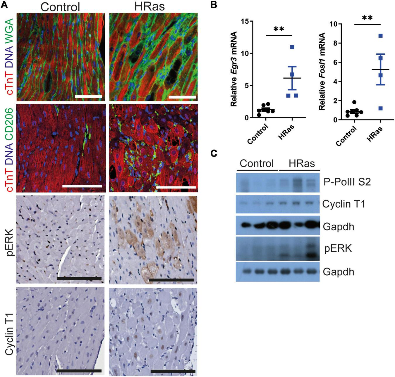 We employed the cardiac-specific, doxycycline-controlled transgenic line TetO-HRas [Tg(tetO-HRAS)65Lc/Nci]; Myh6tTA [Tg(Myh6-tTA)6Smbf/Jm] (30) to overexpress HRasG12V specifically in cardiomyocytes. Mice were generated and removed from doxycycline treatment at 4 weeks of age and the subsequent expression of constitutively active HRasG12V led to an increase in hypertrophic cardiomyocytes (∼10%, Supplementary Figure 1A) interspersed with CD206 positive macrophages and cardiomyocytes of normal volume (Figure 1A), as previously described (30). Hypertrophic cardiomyocytes displayed elevated pERK immunohistochemical staining (Figure 1A) and qRT-PCR analysis confirmed increased expression of the ERK-AP1 target genes Egr3 and Fos1L (Figure 1B), confirming enhanced HRas signalling. Despite the heterogeneity of the model, whole hearts expressing HRasG12V displayed a moderate increase in Cyclin T1 and Phosphorylated RNA Pol II (Figures 1A,C and Supplementary Figure 1B).