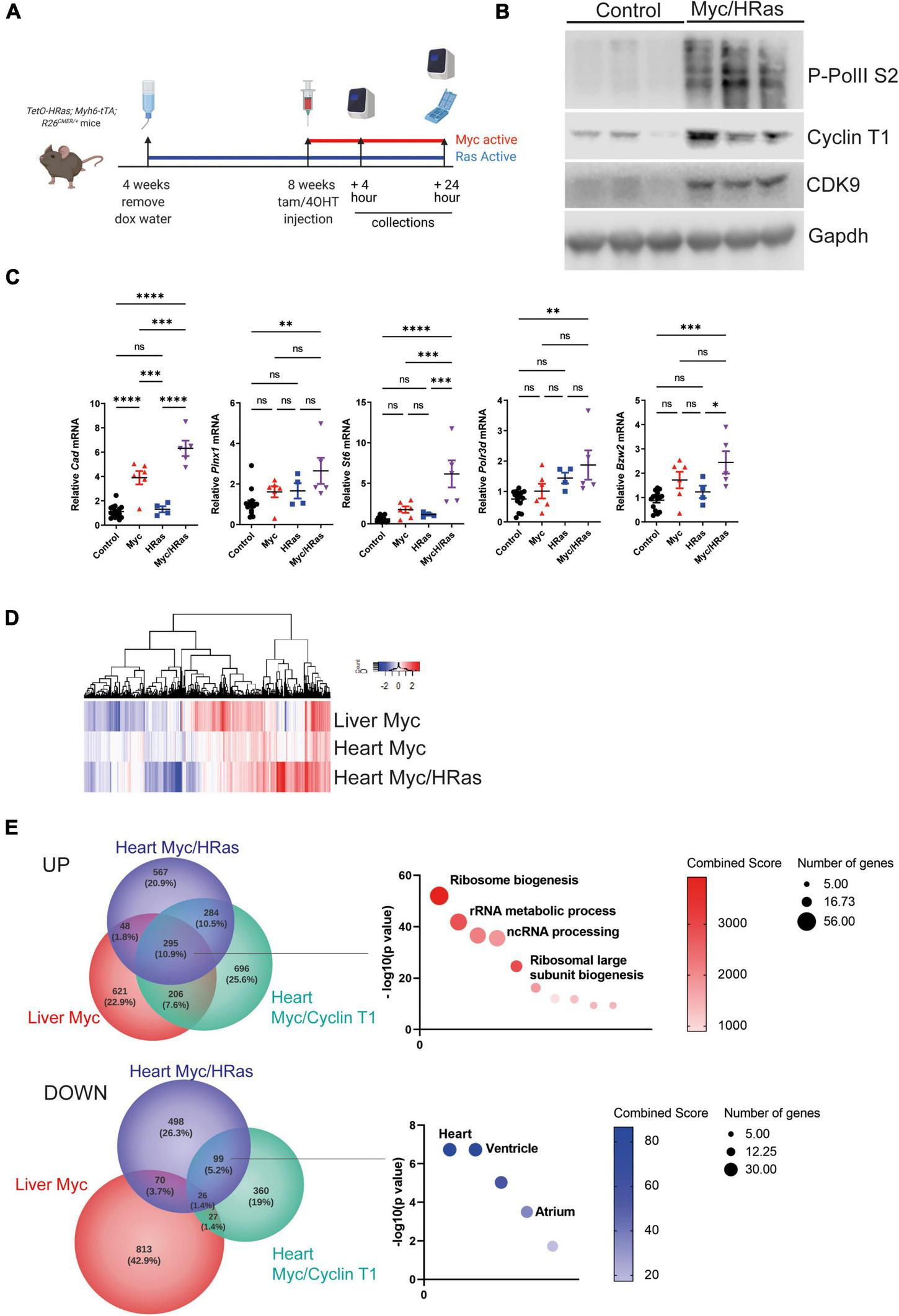 We have previously determined that Myc-driven transcription is limited by the low level of endogenous P-TEFb within the adult heart. To establish if an HRasG12V-driven increase in P-TEFb levels could enhance Myc-driven transcription, we quantified the expression of a panel of Myc target genes post MycERT2 activation. Cad, a Myc target gene previously shown to be transcribed following MycERT2 activation in all tissues, including the heart, showed increased expression in the heart tissue of both Myc activated (R26CMER/) and HRasG12V/Myc activated (TetO-HRas; Myh6-tTA; R26CMER/+) tissues, confirming the functionality of the MycERT2 fusion in both conditions (Figure 2C). We then determined the expression of a panel of Myc target genes that we have previously observed as unchanged in the adult heart in response to MycERT2 activation alone. The co-expression of HRasG12V sensitised the heart tissue to Myc-dependent expression of these targets over controls (Figure 2C). We also compared changes in global gene expression in heart of HRasG12V (TetO-HRas; Myh6-tTA; R26+/+) mice and Myc/HRasG12V (TetO-HRas; Myh6-tTA; R26CMER/+) mice 4 h after MycERT2 activation. We have previously observed marked induction of a Myc-driven transcriptional programme in the liver of MycERT2 expressing (R26 CMER/+) mice in the absence of co-expressed HRasG12V (11) (Figure 2D). In contrast to the weak transcriptional response elicited by MycERT2 activation alone, in the presence of HRasG12V, MycERT2 resulted in a marked transcriptional response (Figure 2D). MycERT2 and HRasG12V expressing hearts displayed 1198 up-regulated DEGs and 693 down regulated DEGs (Supplementary Table 1) in comparison to HRasG12V expression alone. Myc target gene identities overlapped with genes induced by MycERT2 in the adult liver, and in the adult heart in the presence of elevated Cyclin T1 expression (AAV9-driven cardiomyocyte-specific) (11) (Figure 2E). These genes are Myc targets, involved in direct Myc-regulated processes such as ribosomal biogenesis and RNA metabolic processes (Figure 2E, Supplementary Figure 1D, and Supplementary Table 2). In contrast, there was little overlap between downregulated genes observed following MycERT2 and HRasG12V activation in the heart and genes downregulated by MycERT2 alone in the liver, suggesting a level of tissue specificity for Myc-dependent transcriptional repression. Consistent with this, genes downregulated in response to HRasG12V and MycERT2 overlapped with those downregulated in the MycERT2 and Cyclin T1 expressing heart – these genes were characteristic of a homeostatic heart transcriptional programme, such as HCN4, MYOT (Figure 2E and Supplementary Table 3).