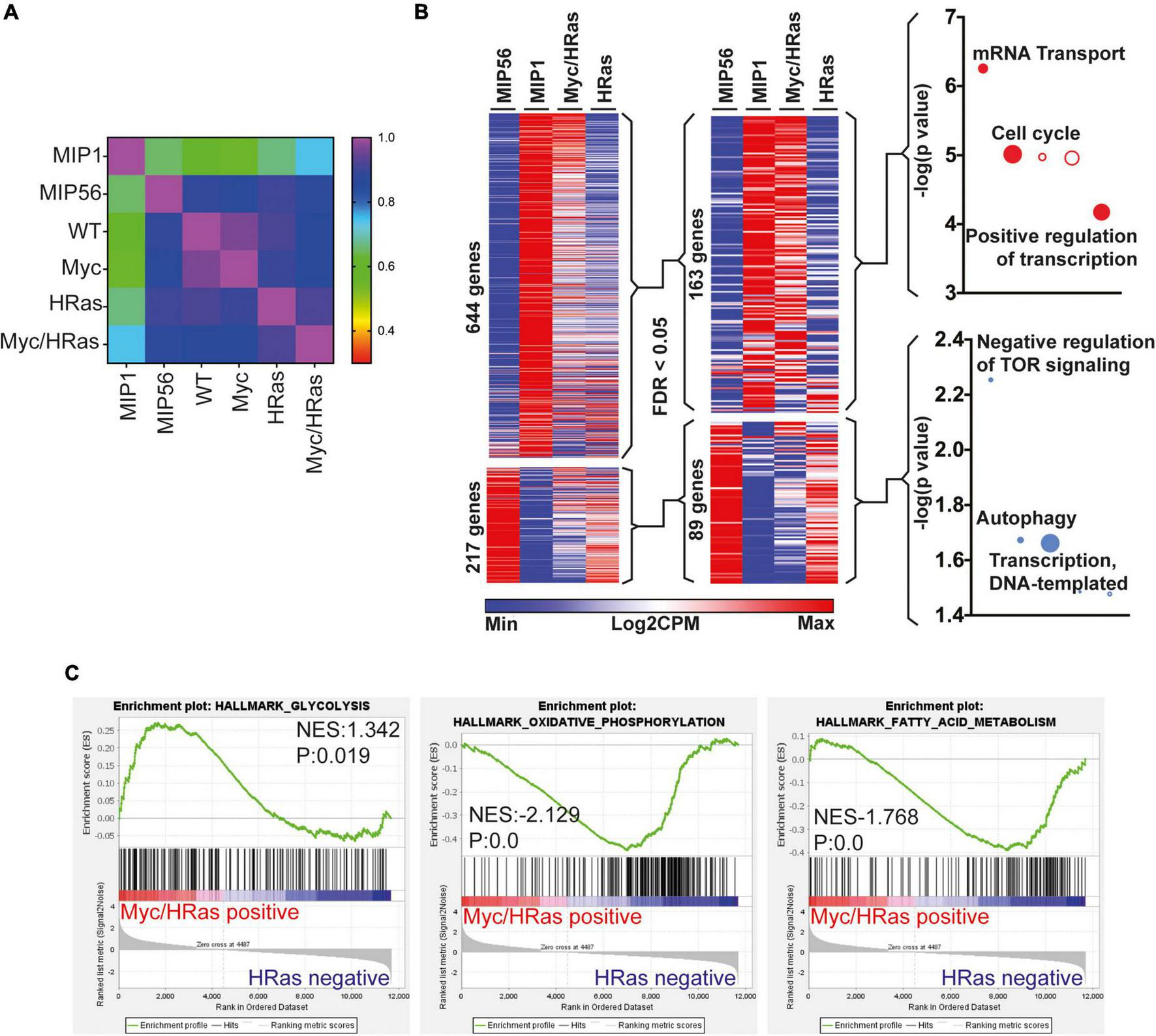 Cardiac MycERT2 and HRasG12V expression result in signalling characteristic of neonatal cardiomyocytes. (A) Pearson correlative analysis of regenerative network genes (described in 14) expressed in day 1 myocardial infarcted heart myocytes (MIP1), adult day 56 myocardial infarcted heart myocytes (MIP56), adult R26+/+ (WT) hearts, adult R26CMER/+ (Myc) hearts, adult TetO-HRas; Myh6-tTA; R26+/+ (HRas) and adult TetO-HRas; Myh6-tTA; R26CMER/+ (Myc/HRas) RNA-seq datasets. (B) Heat map depicts gene expression of the regeneration network genes (described in 14) from RNA-seq of TetO-HRas; Myh6-tTA; R26+/+ (HRas, n = 3) and TetO-HRas; Myh6-tTA; R26CMER/+ P60 adult hearts (Myc/HRas, n = 3). MIP1.Myo and MIP56.Myo denotes neonatal (P1) or adult (P56) cardiomyocytes isolated from myocardial infarction-operated hearts (n = 4). Regeneration network genes were filtered for genes differentially expressed (DEGs) between TetO-HRas; Myh6-tTA; R26+/+ (HRas) and TetO-HRas; Myh6-tTA; R26CMER/+ (Myc/HRas) hearts (FDR < 0.05). (C) Gene set enrichment analysis of glycolysis, oxidative phosphorylation, and fatty acid metabolism gene lists in comparison to differential gene expression observed between TetO-HRas; Myh6-tTA; R26CMER/+ mice (Myc/HRas, n = 3) and TetO-HRas; Myh6-tTA; R26+/+ mice (n = 3) at 4 h post administration of 4-OHT.