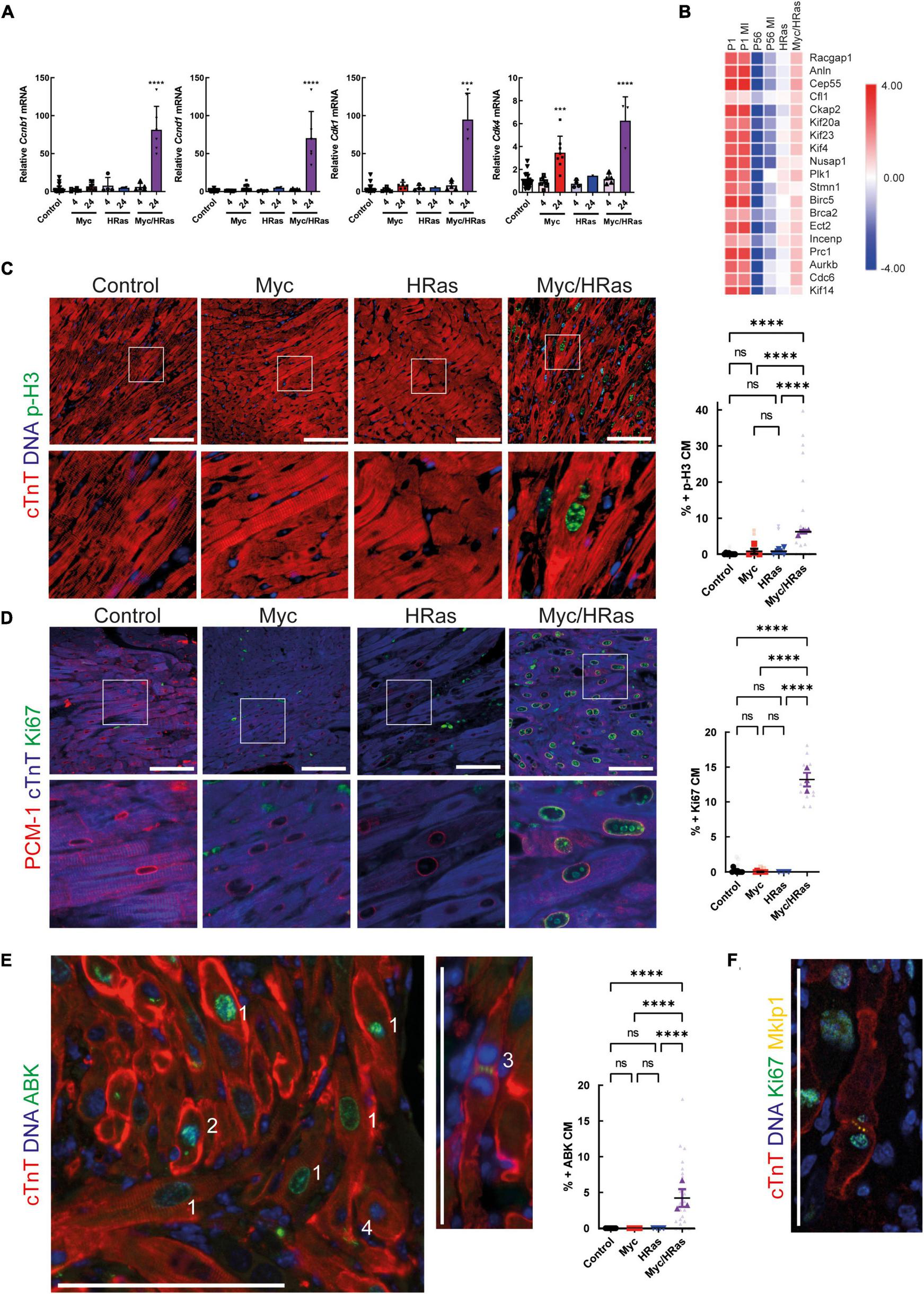 To determine if this Myc-dependent “regenerative transcriptional response” results in productive proliferation, MycERT2/HRasG12V expressing mice (TetO-HRas; Myh6-tTA; R26CMER/+) or mice expressing either HRasG12V or MycERT2 alone were administered tamoxifen via intraperitoneal injection at 8 weeks of age to activate MycERT2 and hearts collected after 24 h. Transcriptional analysis indicated that activation of MycERT2 in the presence of HRasG12V induced robust expression of multiple cell cycle genes (Cdk4, Ccnd1, Cdk1, Ccnb1) that were not induced by HRasG12V or Myc activation alone (except Cdk4 which is a known Myc target, Figure 4A). Furthermore, markers of cytokinesis were upregulated in Myc and HRasG12V expressing hearts (Figure 4B) and GSEA indicated that these hearts displayed significant enrichment for genes involved in cell cycle-related pathways such as E2F targets and G2/M checkpoints (Supplementary Figure 2B). These transcriptional events also underpinned significant markers of cell-cycle progression indicated by Ki67 (general cell cycle) and p-H3 (mitotic) positive cardiomyocytes specifically marked by PCM1 and cardiac troponin T, respectively (Figures 4C,D). In addition, Aurora B kinase displayed staining representative of cell cycle progression (prophase, metaphase, late anaphase/telophase, and mid body localisation) combined with features of disassembled sarcomeres that become marginalised to the cell periphery (4, 42) (Figure 4E and Supplementary Figure 3). Furthermore, Mklp1 expression was observed in cardiomyocytes at the cleavage furrow (Figure 4F).
