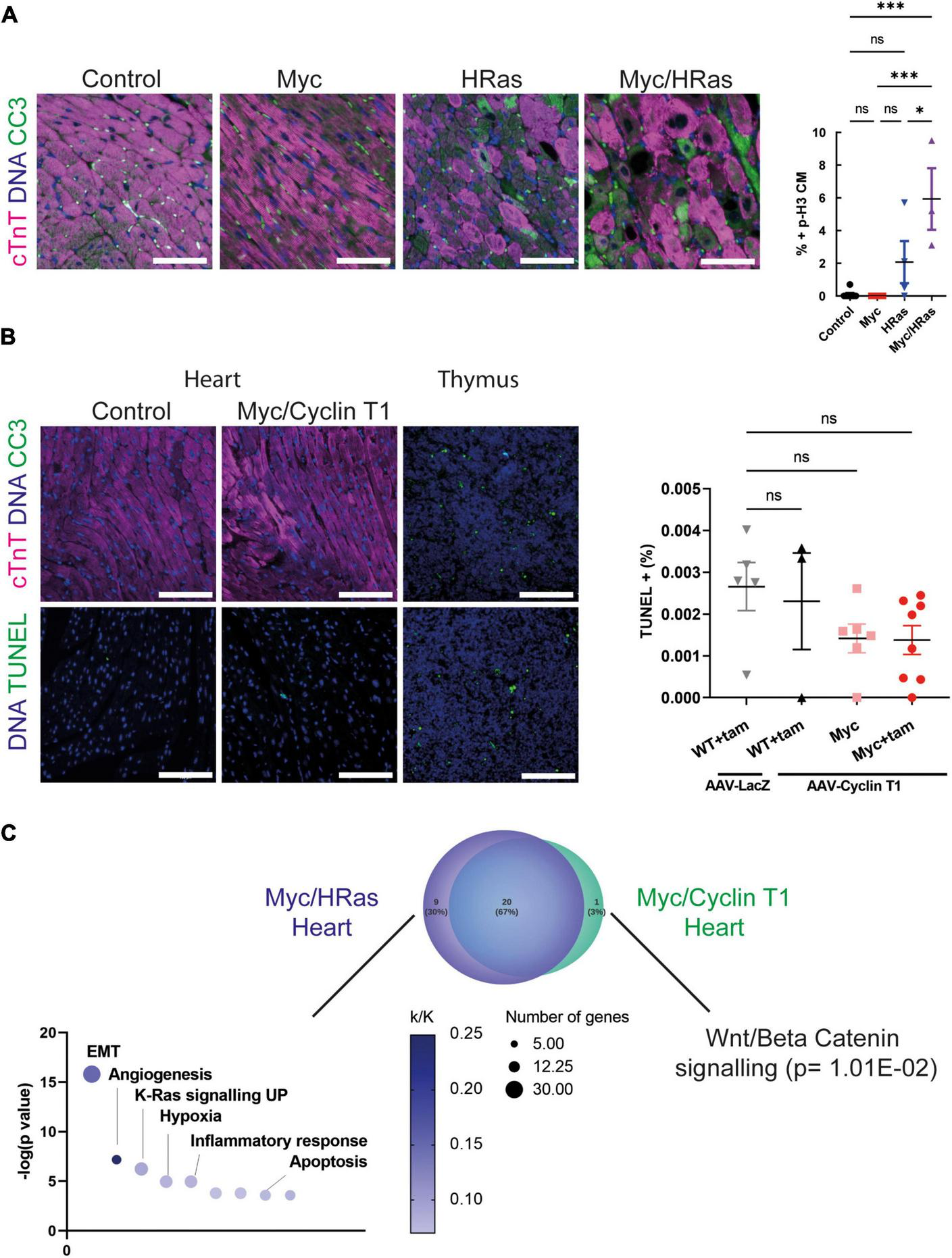 Cardiac HRasG12V and MycERT2 expression results in cardiomyocyte apoptosis. (A) Left- immunofluorescent staining of cleaved caspase 3 (green) and cardiac troponin (pink) in heart from control, TetO-HRas; Myh6-tTA; R26+/+ (HRas), R26CMER/+ (Myc) and TetO-HRas; Myh6-tTA; R26CMER/+ (Myc/HRas) mice 4 weeks post withdrawal of doxycycline and 24 h post administration of tamoxifen. Representative images based on analysis of at least 3 independent mice. Right- quantification of CC3 positive cardiomyocytes in hearts isolated from control (R26+/+; TetO-HRas, R26+/+; Myh6-tTA or R26+/+, black, n = 8), TetO-HRas; Myh6-tTA; R26+/+ (HRas, red, n = 4), R26CMER/+ (Myc, blue, n = 4) and TetO-HRas; Myh6-tTA; R26CMER/+ (Myc/HRas, purple, n = 3) mice 4 weeks post withdrawal of doxycycline and 24 h post administration of tamoxifen. Bars are 100 μm Representative images based on analysis of 5 images per mouse; error bars show s.e.m. One-Way ANOVA with multiple comparisons test; Myc/HRas vs control: p = 0.0003, Myc/HRas vs Myc: P = 0.0006, Myc/HRas vs HRas; Myh6-tTA; R26+/+: p = 0.0295. (B) Left- immunofluorescent staining of heart from Control and Myh6-Cre; R26LSL– CMER/+ (Myc/Cyclin T1) mice 4 weeks post systemic infection with an AAV-Cyclin T1 adeno-associated virus and 48 post administration of tamoxifen (tam) at adulthood. Top: Control is R26+/+, cleaved caspase 3 (green) and cardiac troponin (pink), Bottom: Control is Myh6-Cre; R26LSL– CMER/+ without tam treatment. TUNEL (green). Representative images based on analysis of 5 independent mice. Right- quantification of TUNEL positive cells in hearts isolated from R26+/+ (WT) mice infected with AAV-LacZ and or AAV-Cyclin T1 and Myh6-Cre; R26LSL– CMER/+ (Myc) mice 4 weeks post systemic infection with an adeno-associated virus and 48 post administration of tamoxifen (tam). Bars are 100 μm. Representative images based on analysis of 5 images per mouse; error bars show s.e.m. Thymus is shown as a positive control. One-Way ANOVA with multiple comparisons test. ns = not significant. (C) Venn diagram of the overlap of the GSEA hallmark signatures obtained from the upregulated gene expression profile of Myc/HRas expressing hearts or Myc/Cyclin T1 expressing hearts. Adult mouse hearts were either isolated 4 weeks post systemic infection with an adeno associated virus encoding Ccnt1 (AAV9-Ccnt1) compared to control and heart from TetO-HRas; Myh6-tTA; R26CMER/+ (n = 3) 4 weeks after HRasG12D expression and 4 h post Myc activation compared to control, as determined by RNA sequencing (FDR < 0.05 and abs(log2FC) > 0.5). The significant non-overlapping GSEA hallmark signatures are shown below.