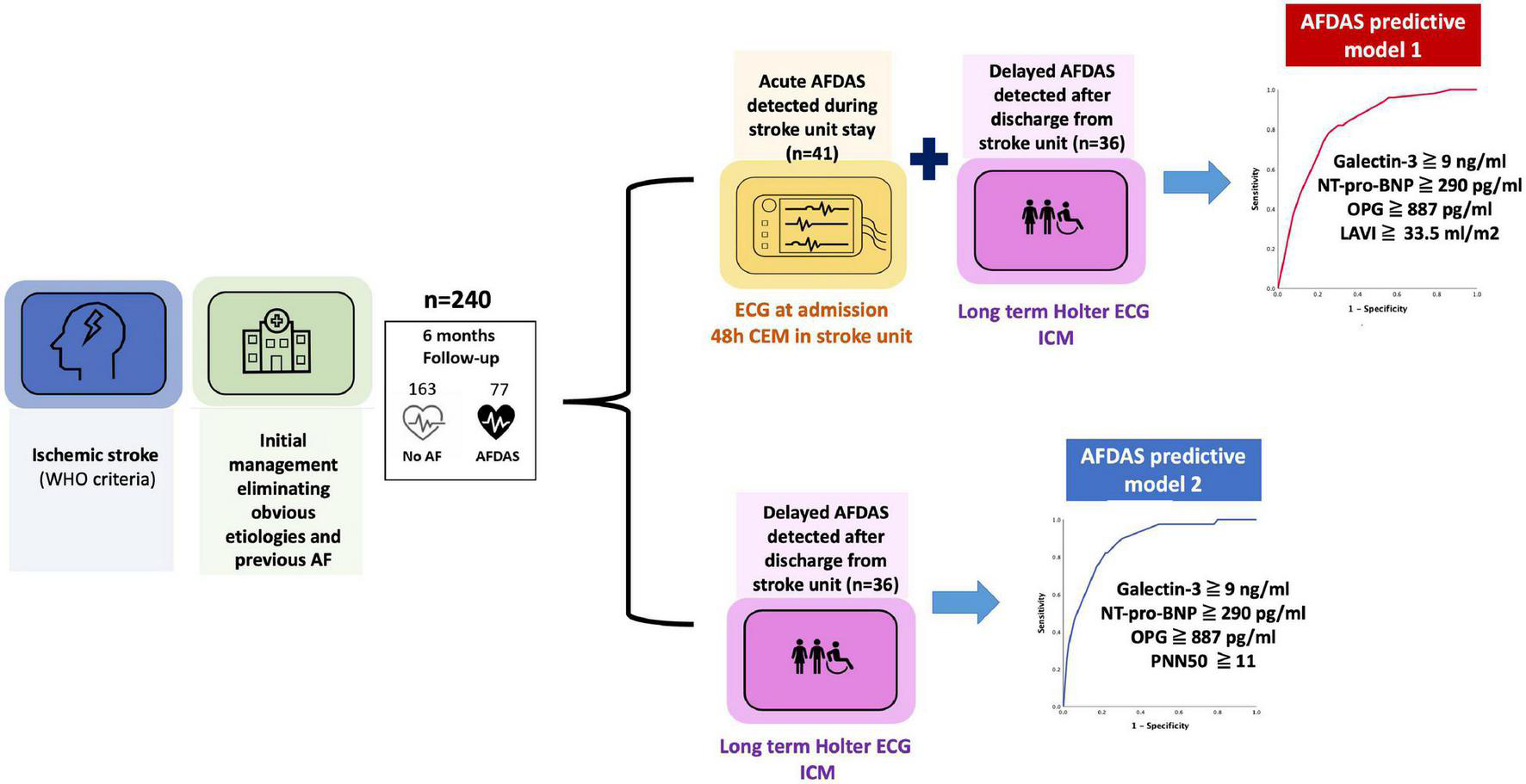 Patients without previously known AF admitted to the Dijon University Hospital (France) stroke unit for acute ischemic stroke were prospectively enrolled. The primary endpoint was the presence of AFDAS at 6 months, diagnosed through admission ECG, continuous electrocardiographic monitoring, long-term external Holter during the hospital stay, or implantable cardiac monitor if clinically indicated after discharge.
