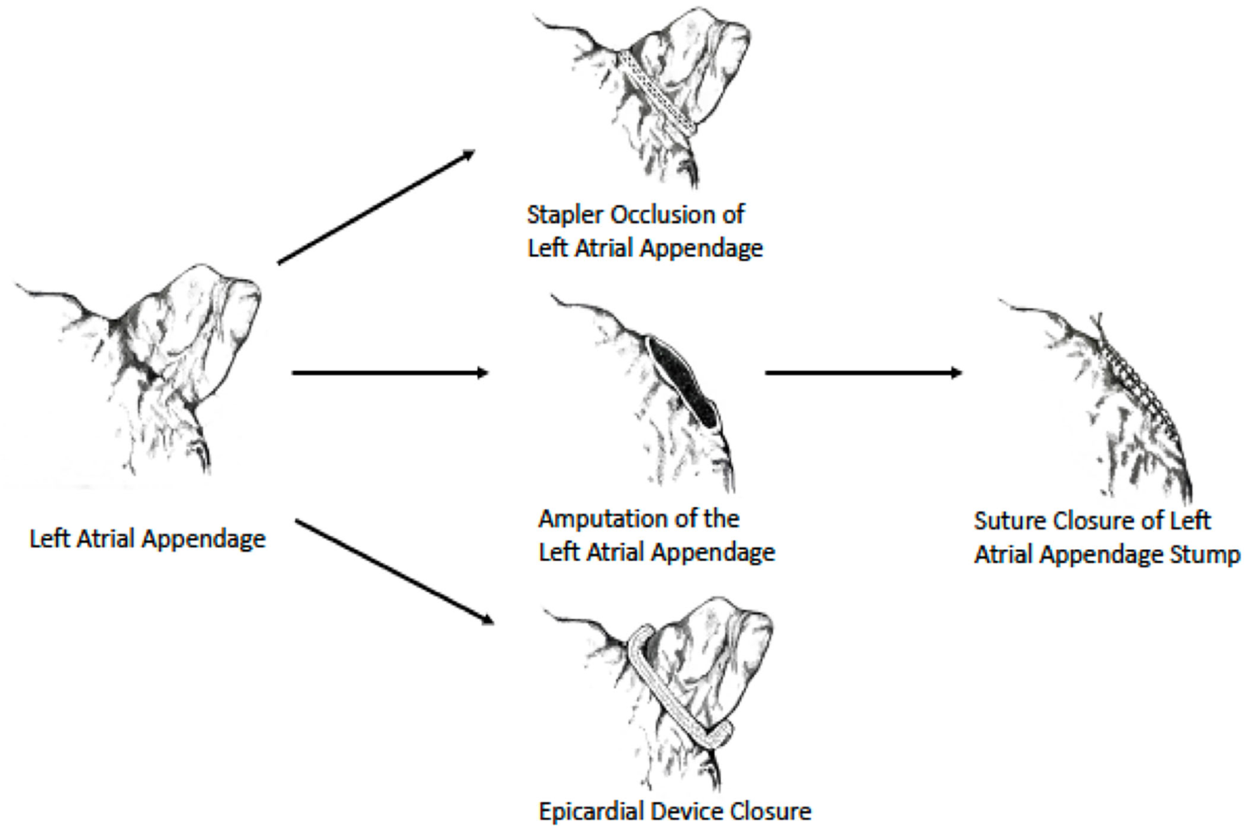 Figure 1. Surgical LAA occlusion techniques used in LAAOS III trial. Image reprinted with permission from the New England Journal of Medicine (52).