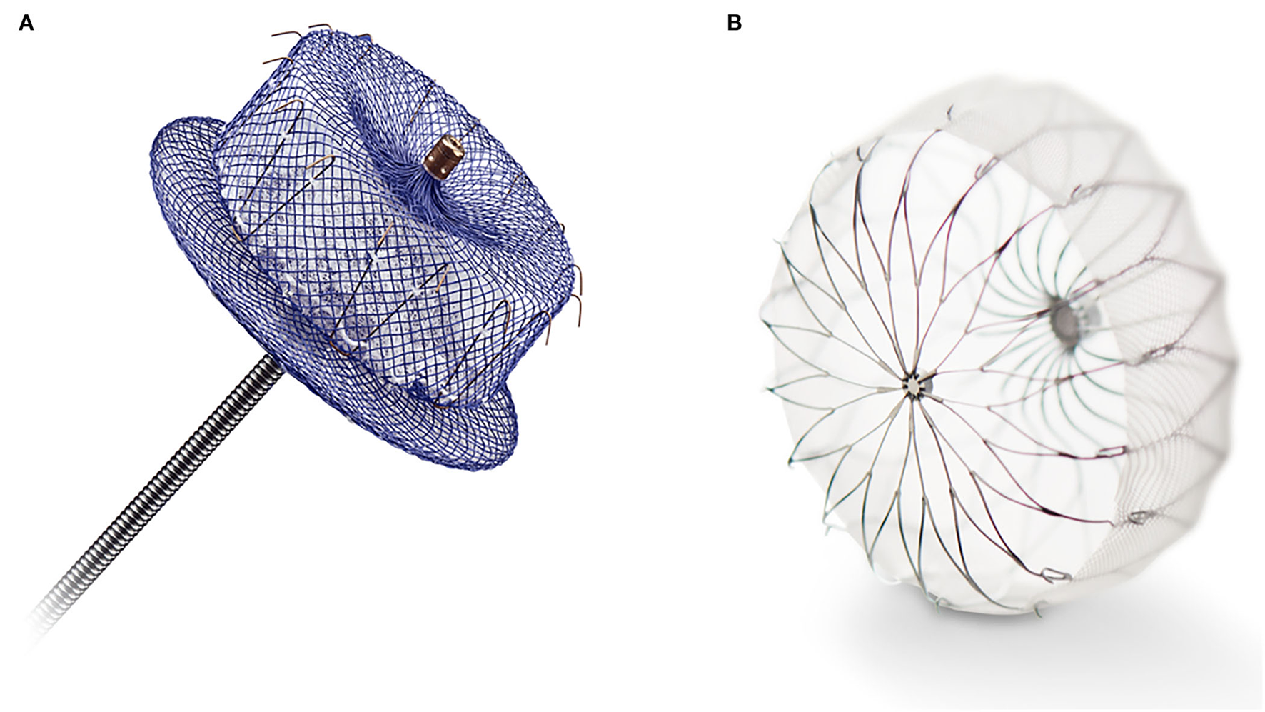 Figure 2. (A) The Amplatzer AMULET Left Atrial Appendage Occluder (Abbott, Abbott Park, Illinois, USA). (B) The WATCHMAN FLX LAA system (Boston Scientific, Marlborough, Massachusetts, USA).