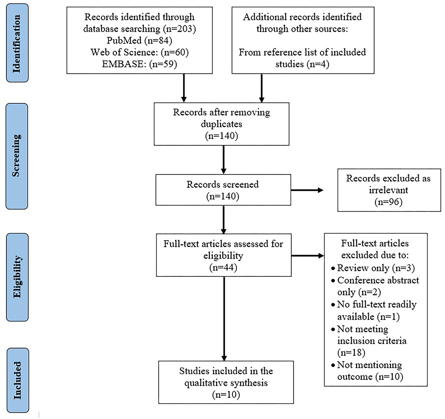 Initial search included 203 articles from PubMed (n = 84), Web of Science (n = 60), and EMBASE (n = 59). Four articles were found through the reference lists. After removing duplicates (n = 67), the title and abstract of 140 articles were reviewed, through which the irrelevant studies were identified (n = 96).