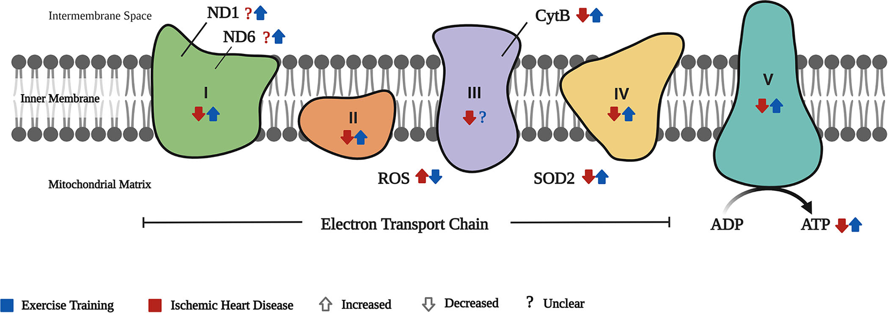 To understand the effect of ET on the cardiac mitochondrial function in IHD, the cardiac mitochondrial respiration was considered the primary outcome. This included components of the electron ETC, such as complexes I–V activity, cytB, NADH dehydrogenase subunits (ND1 and 6), as well as the production of ROS, SOD2, RCR, and ATP.