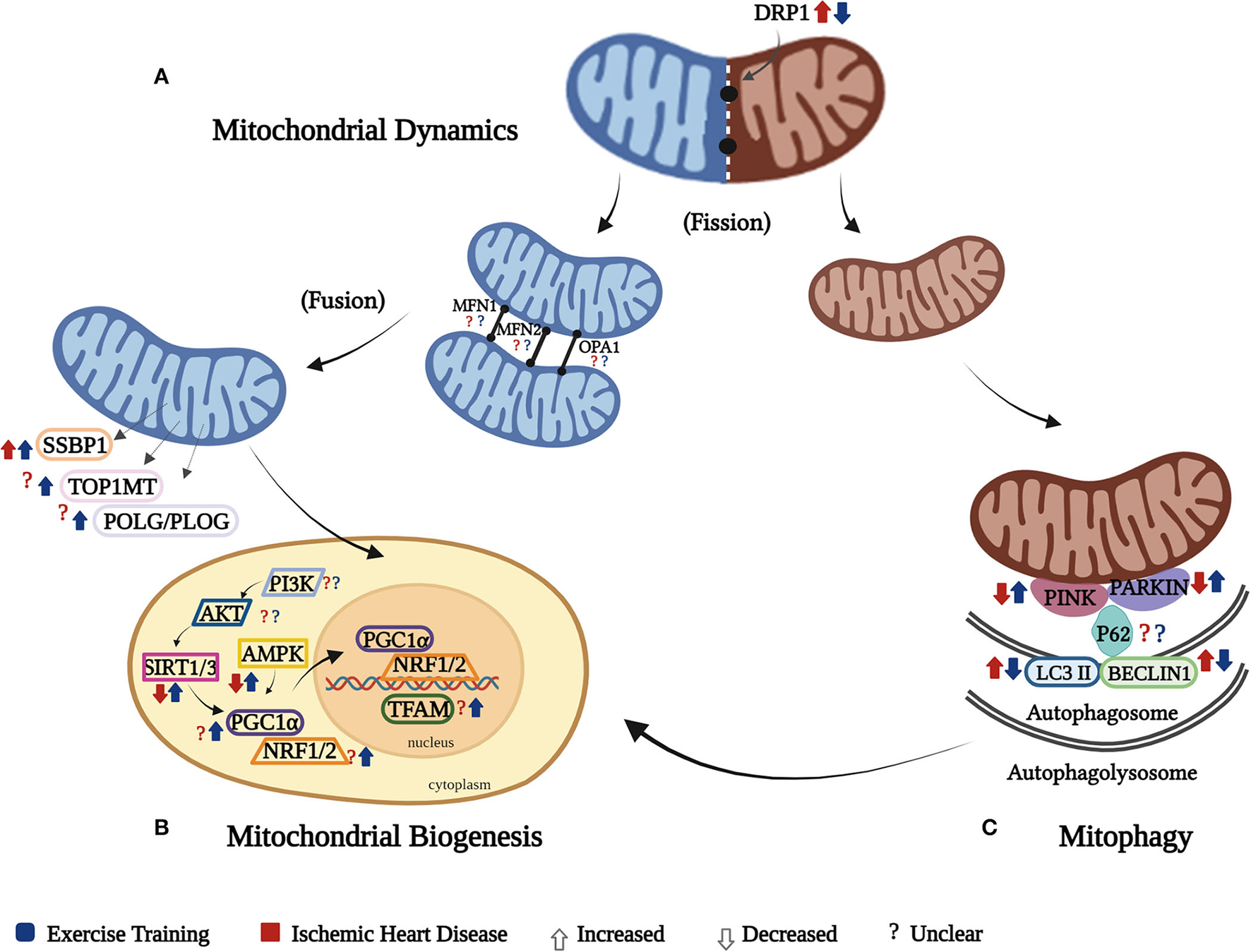 Exercise training could improve cardiac mitochondrial functions, including respiration, biogenesis, dynamics, and mitophagy in IHD.