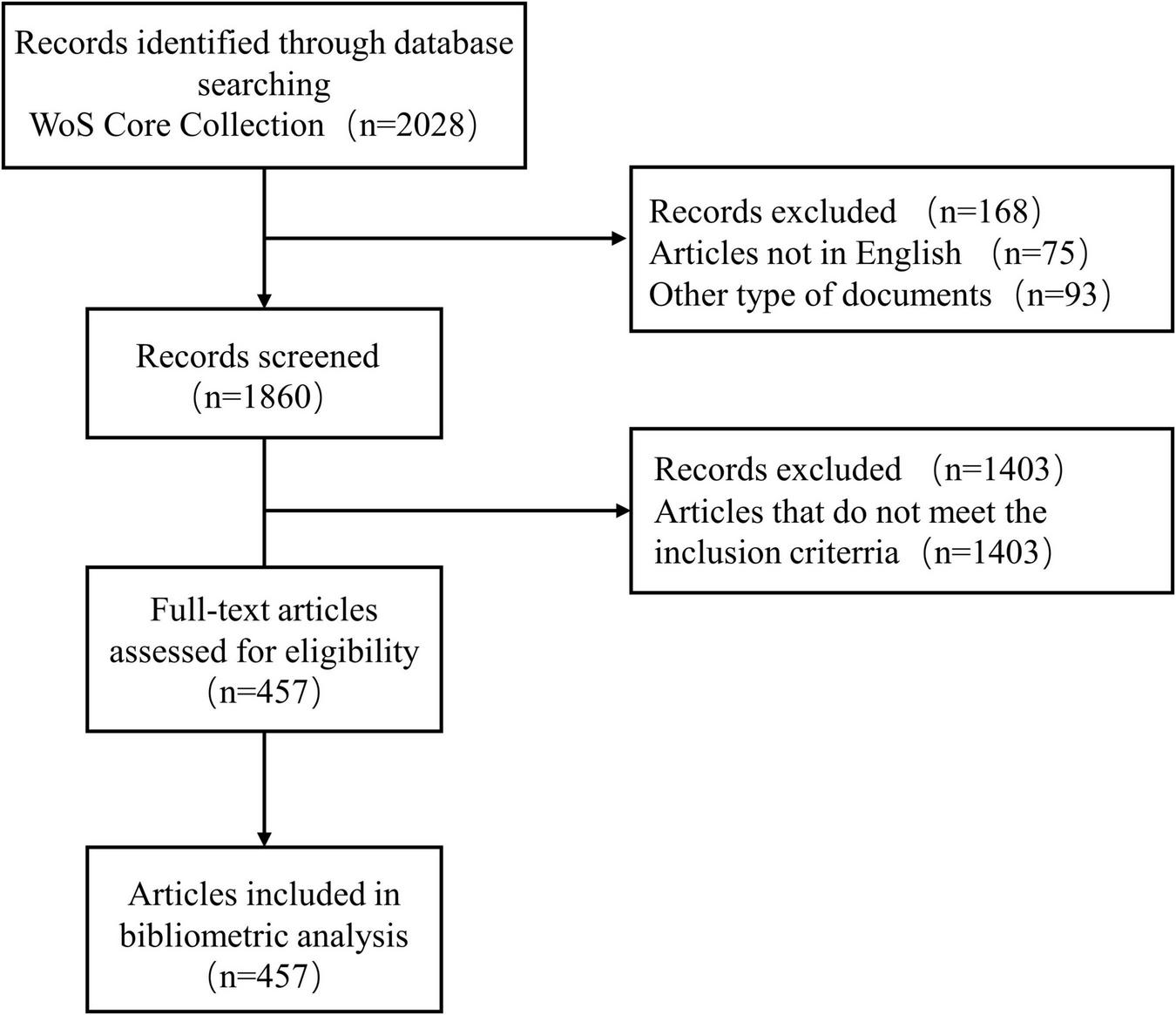 A total of 2,028 publications from WoSCC were identified in the literature search. A total of 457 studies, including 295 articles and 162 reviews, were selected for further data extraction based on the titles and abstracts of papers. Figure 1 shows a flowchart of the literature selection process. We created a histogram (Figure 2) to represent the number of annual publications over the last 20 years, which indicated the development trend of research in this field. The number of publications has been increasing in recent years, indicating growing attention and interest of researchers in this field. From 2002 to 2013, the number of publications on CHD and gut microbiota does not exceed 8. But since 2014, this number has begun to increase, reaching a peak of publication in the past 3 years. Overall, these data suggest that research on CHD and gut microbiota has gained widespread attention. In particular, significant progress has been made in this field since 2019.