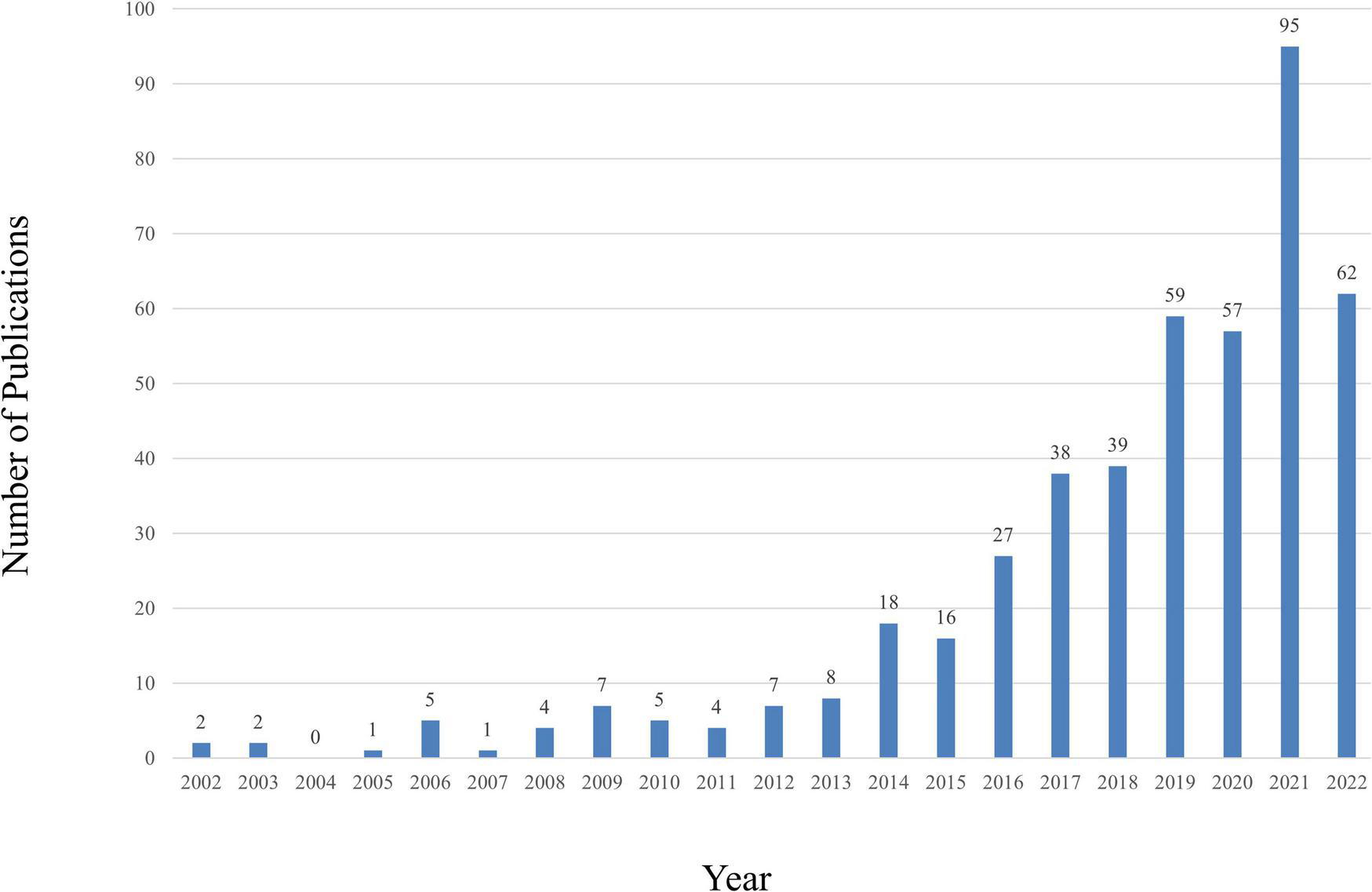 The number of annual publications relating to research about CHD and gut microbiota from 2002 to 2022.