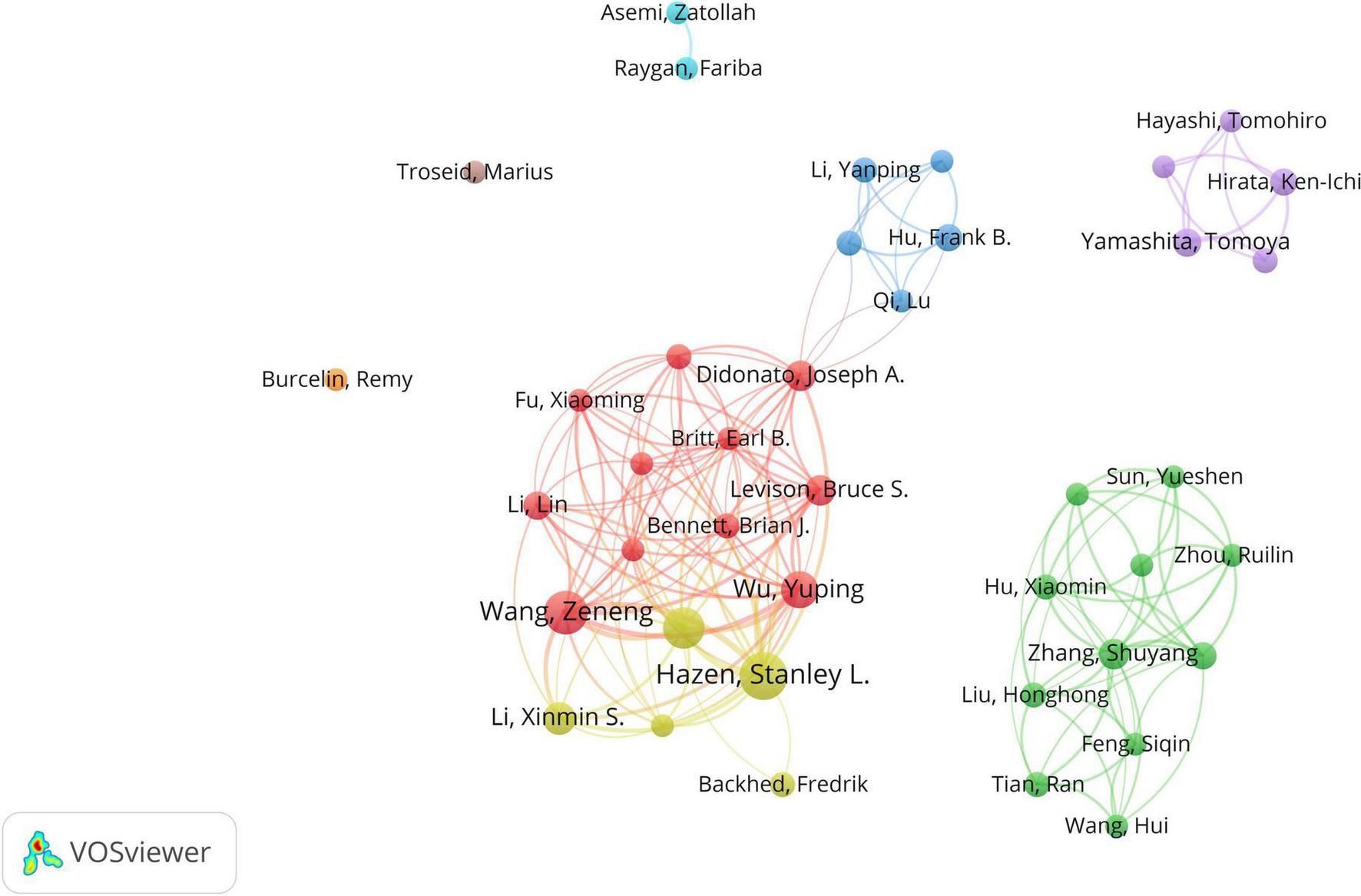 The network of authors contributed to research about CHD and gut microbiota. In the network, author contribution is reflected by node size. The connection strength is reflected by the thickness of line.