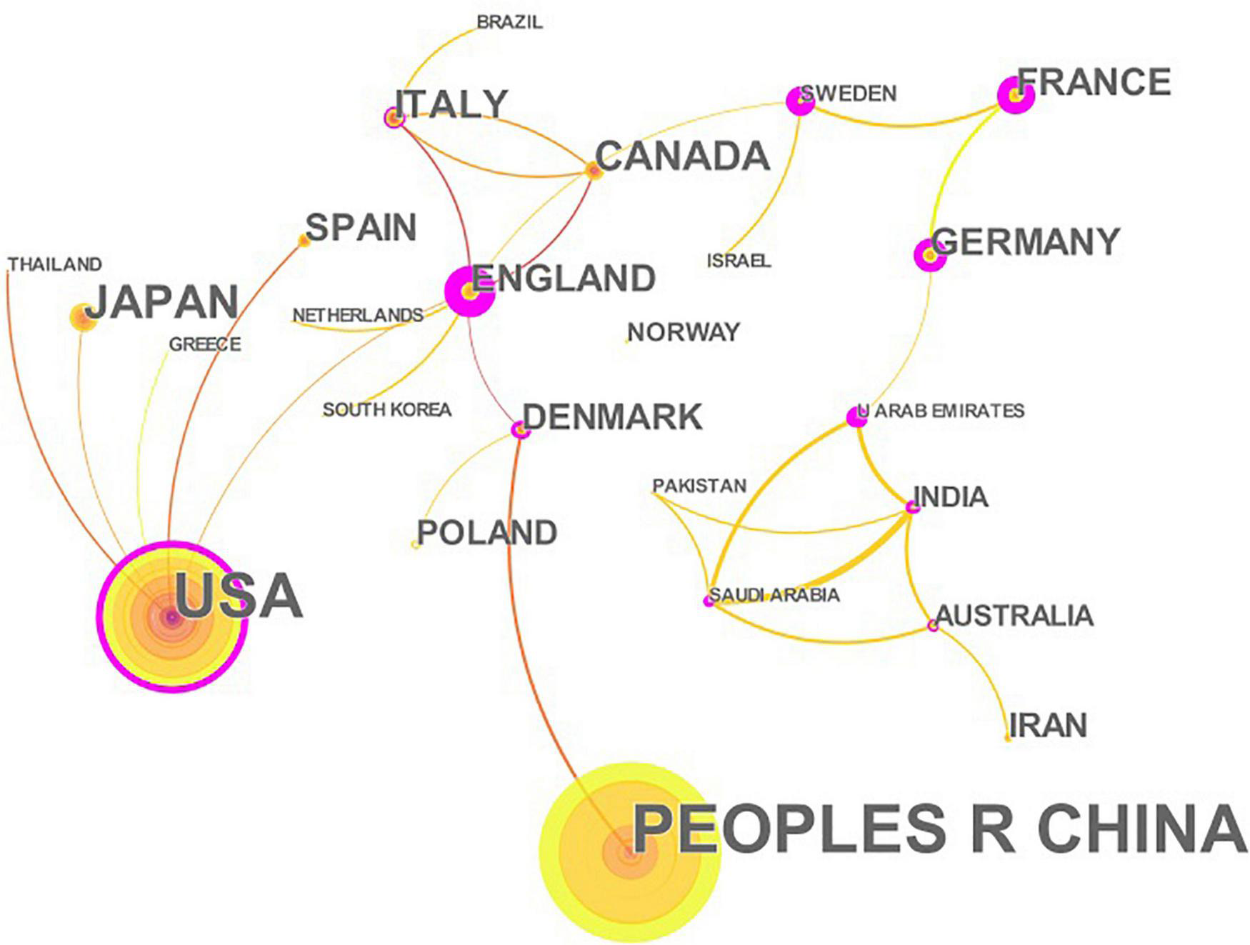 The network of countries/territories engaged in the research about CHD and gut microbiota. In the networks, the larger the node was, the more contribution the country/territory had made to that field. The nodes with higher centrality (>0.1) are highlighted with purple rings. The color of the line represents the time of first co-occurrence. The thicker the line is, the greater the connection strength is (calculation method based on cosine).