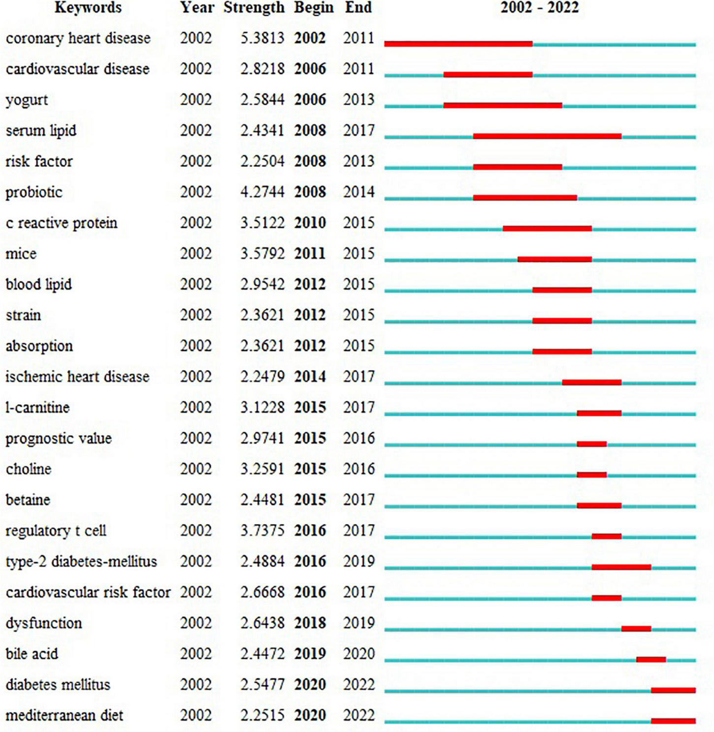 The analysis of keywords provided us with a glimpse not only into the subject matter of the article but also into the hotspots of a particular area of research. The top 20 keywords with the highest frequency were presented in Table 5. The VOSviewer was employed to visualize the keywords’ network, as demonstrated in Figure 6. The clusters of 6 colors represented 6 research directions. The keywords of the red cluster were coronary heart disease, inflammation, cholesterol, risk factor, probiotic, metabolic syndrome, meta-analysis, hypercholesterolemia, etc. The keywords of the green cluster were diet, heart failure, hypertension, infarction, and regulatory t-cells. The keywords of the blue cluster were trimethylamine n-oxide, metabolism, phosphatidylcholine, stroke, red meat, etc. The keywords of the yellow cluster were gut microbiota, cardiovascular risk-factors, acute myocardial infarction, biomarker, nutrition, etc. The keywords of the purple cluster were atherosclerosis, endothelial dysfunction, c-reactive protein, mediterranean diet, low density lipoprotein, etc. The keywords of the dark blue cluster were myocardial infarction, bile acids, blood pressure, chain fatty acids, etc.