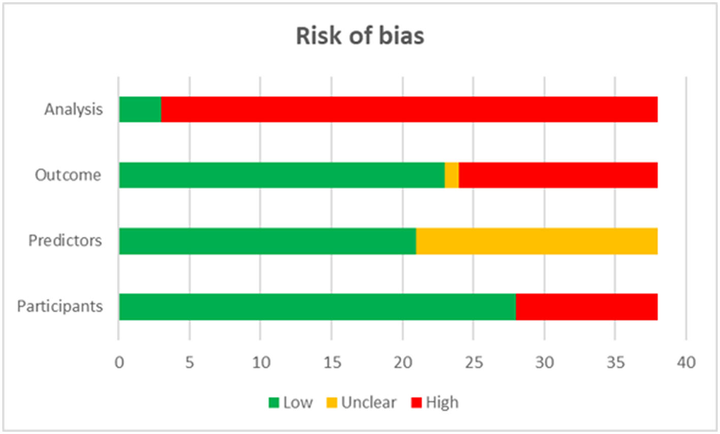 The quality assessment showed that 92.11% of included studies were graded as high risk in the domain of analysis, 36.84% were graded as high risk in the domain of outcomes, and 26.32% in that of participants (Figure 1).