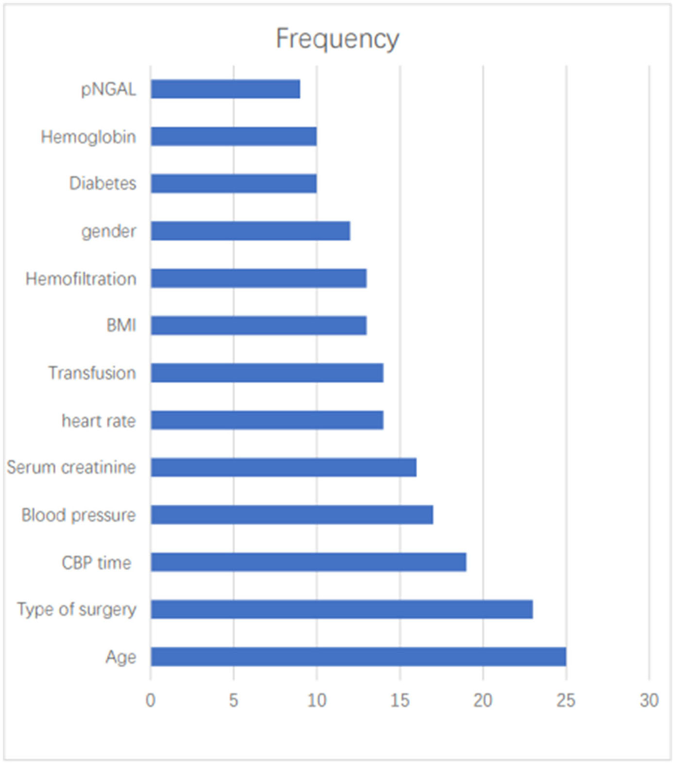 The most commonly used predictors were Age (n = 25, 41.67%), Types of surgery (n = 23, 38.33%), CBP time (n = 19, 31.67%), Blood pressure (n = 17, 28.33%), SCr (n = 16, 26.67%), heart rate (n = 14, 23.33%), Transfusion (n = 14, 23.33%), BMI (n = 13, 21.67%), Hemofiltration (n = 13, 21.67%), gender (n = 12, 20.00%), diabetes (n = 10, 16.67%), Hemoglobin (n = 10, 16.67%), pNGAL (n = 9, 15.00%) (Figure 2).