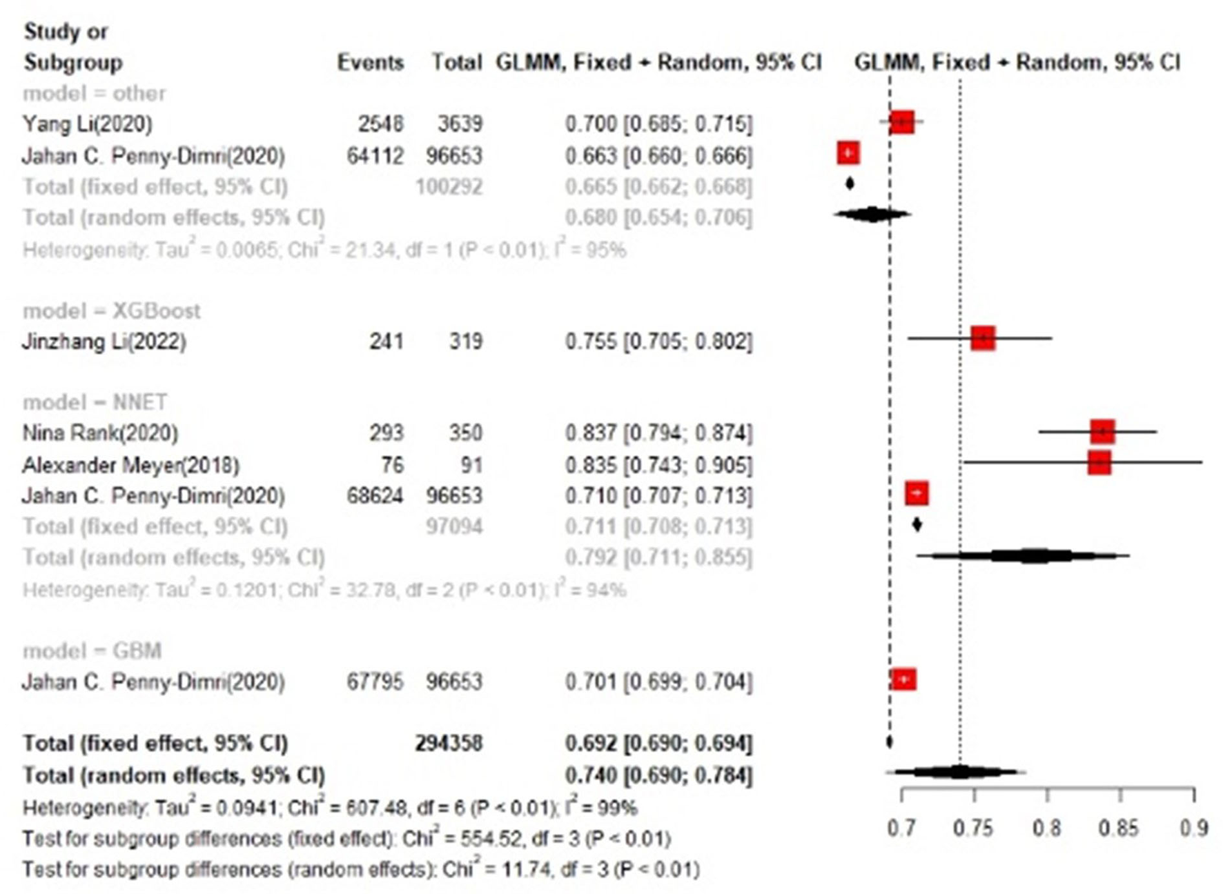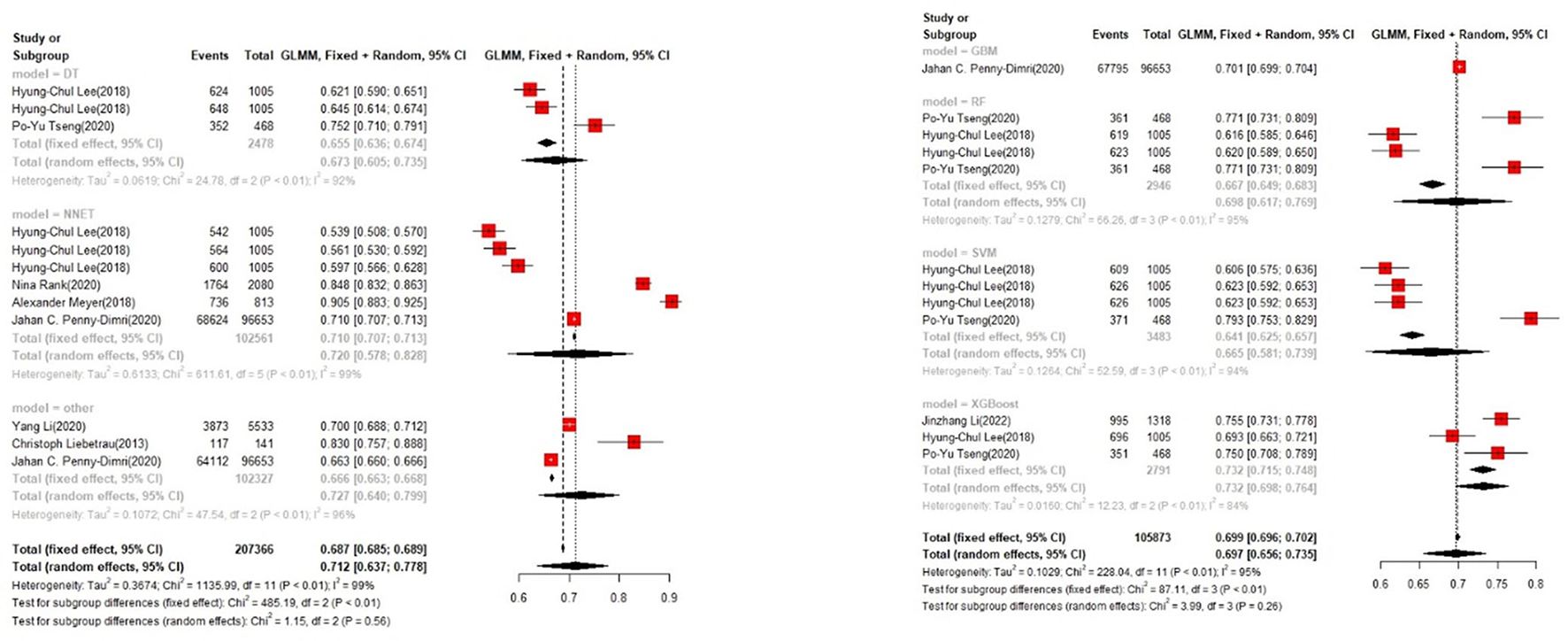 In the test set, logistic regression was also the most commonly applied model [n = 10, accuracy = 0.708 (0.705, 0.71)]. NNET was of the best effect [n = 3, accuracy = 0.711 (0.708, 0.713)], with large modeling sample size, so we think NNET has the best effect. XGBoost also showed an excellent effect in all models [accuracy = 0.755 (0.705, 0.802)], while its modeling sample size was limited (Figures 5, 6).
