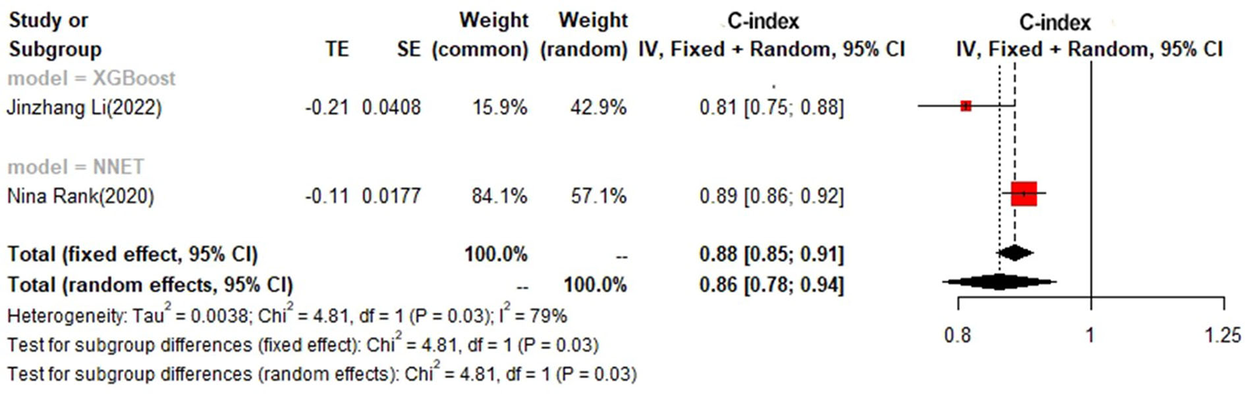 In the test set, logistic regression was also the most commonly applied model [n = 8, c-index = 0.75 (0.74, 0.76)]. NNET and XGBoost presented excellent performance, with the c-index of 0.89 (0.86, 0.92) and 0.81 (0.75, 0.88), respectively, while the modeling sample size of these two models was limited (Figures 9, 10).