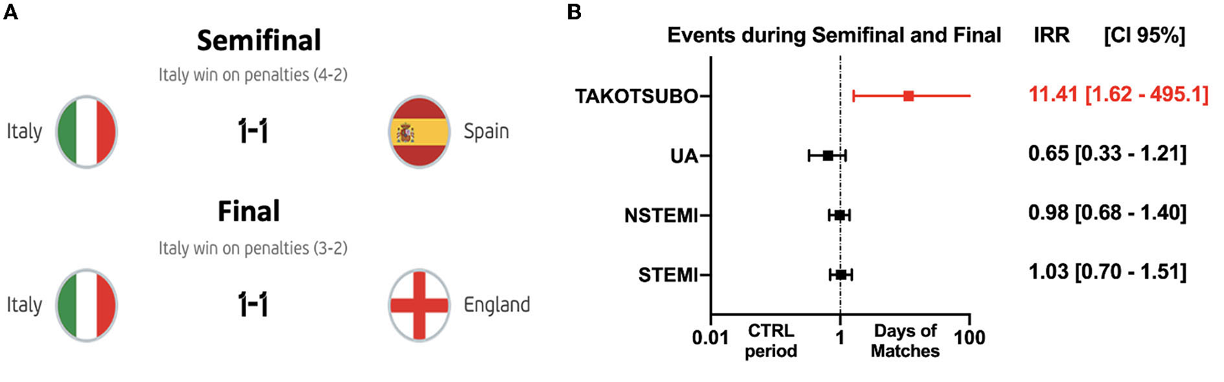 Cardiovascular hospitalizations in the Cardiac Care Units of 49 hospital networks in Italy were assessed by emergency physicians during the UEFA Euro 2020 Football Championship. We compared the events that occurred during matches involving Italy with events that occurred during the remaining days of the championship as the control period. ACE was assessed in 1,235 patients. ACE during the UEFA Euro 2020 Football Championship semifinal and final, the most stressful matches ended with penalties and victory of the Italian team, were assessed. A significant increase in the incidence of Takotsubo Syndrome (TTS) by a factor of 11.41 (1.6–495.1, P < 0.003), as compared with the control period, was demonstrated during the semifinal and final, whereas no differences were found in the incidence of ACS [IRR 0.93(0.74–1.18), P = 0.57]. No differences in the incidence of ACS [IRR 0.98 (0.87–1.11; P = 0.80)] or TTS [IRR 1.66(0.80–3.4), P = 0.14] were found in the entire period including all matches of the UEFA Euro 2020 compared to the control period.