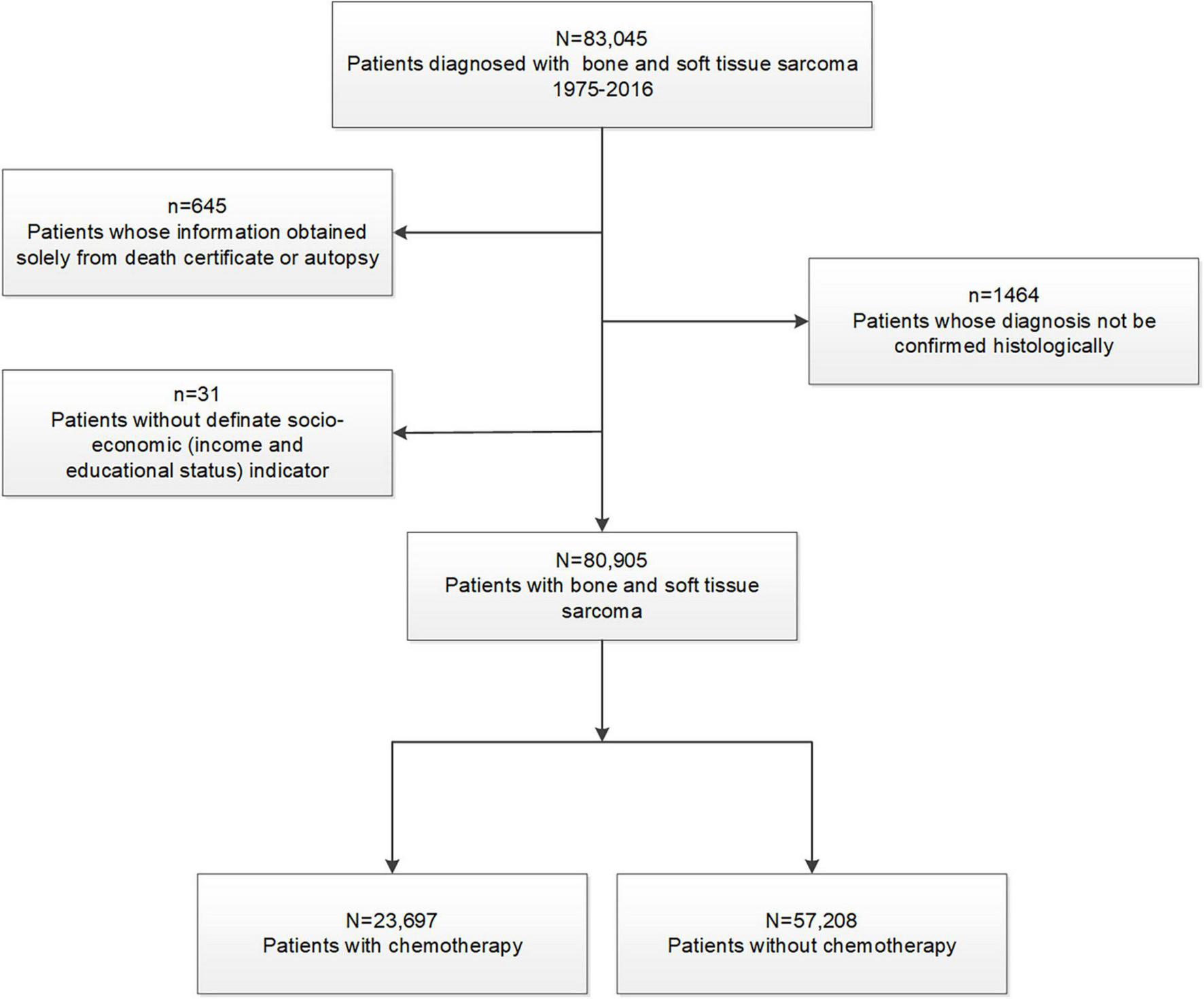 For objective 3, we conducted subgroup analysis by histological subtype and clinical stage to determine if chemotherapy increased the risk of fatal HD in sarcoma patients. The survival time was from sarcoma diagnosis until fatal HD; values recorded as 0 months in the SEER database were converted to one-half of a month according to accepted epidemiological practices (19). Statistical significance was accepted at P < 0.05 (two-sided). Analyses were performed using SEER*Stat software version 8.3.6 and R version 3.51 statistical software.