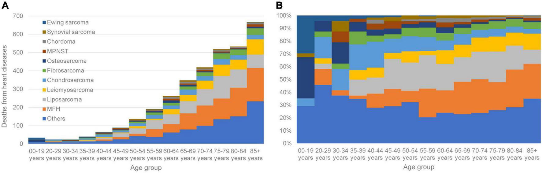 Figure 2. Fatal HD among sarcoma patients as a function of age group. (A) The y-axis depicts the absolute number of HD deaths and the x-axis depicts the age group at time of diagnosis. The colors depict the histological subtypes of sarcoma. (B) The y-axis depicts the relative number of HD deaths and the x-axis depicts the age group at time of diagnosis. The colors depict the histological subtypes of sarcoma.