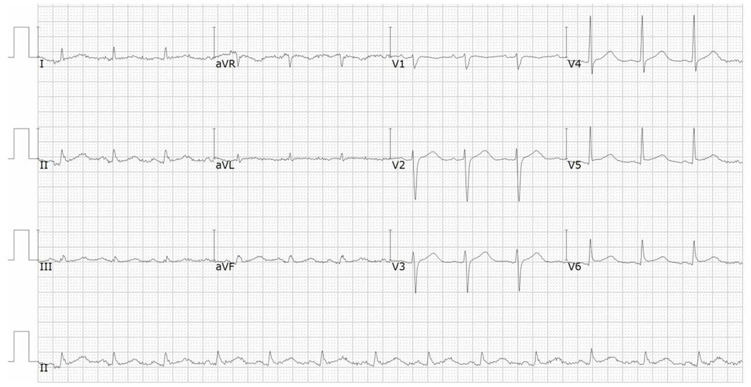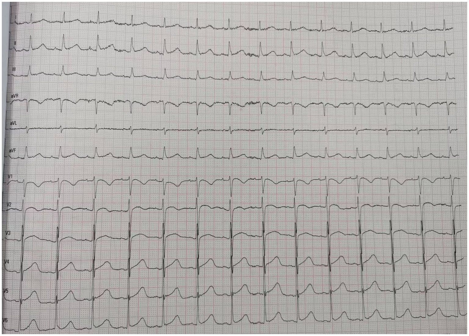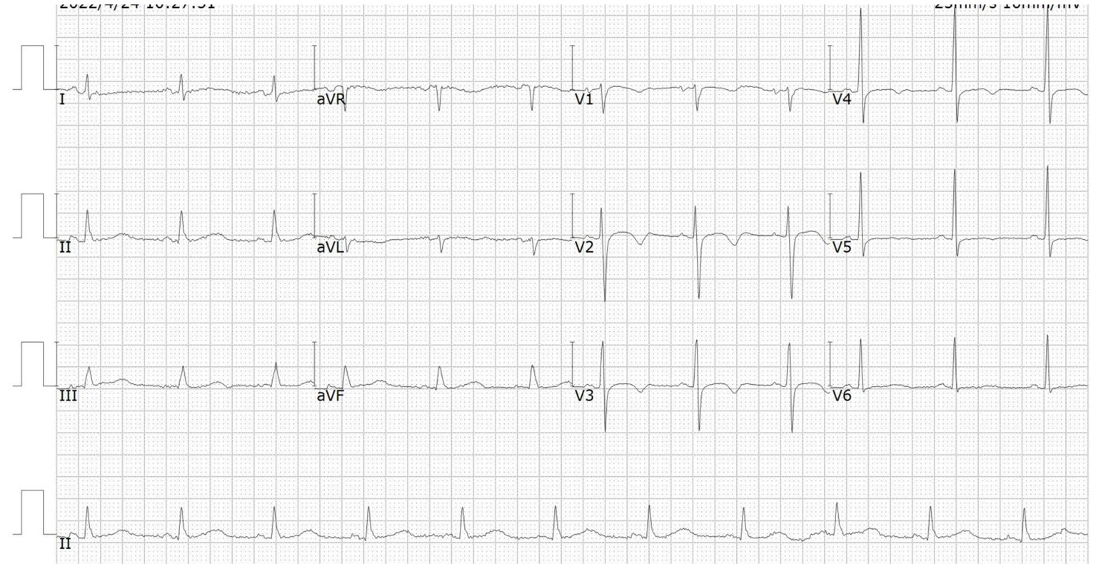 ECG on admission showed ST-segment elevation in leads V5 and V6.