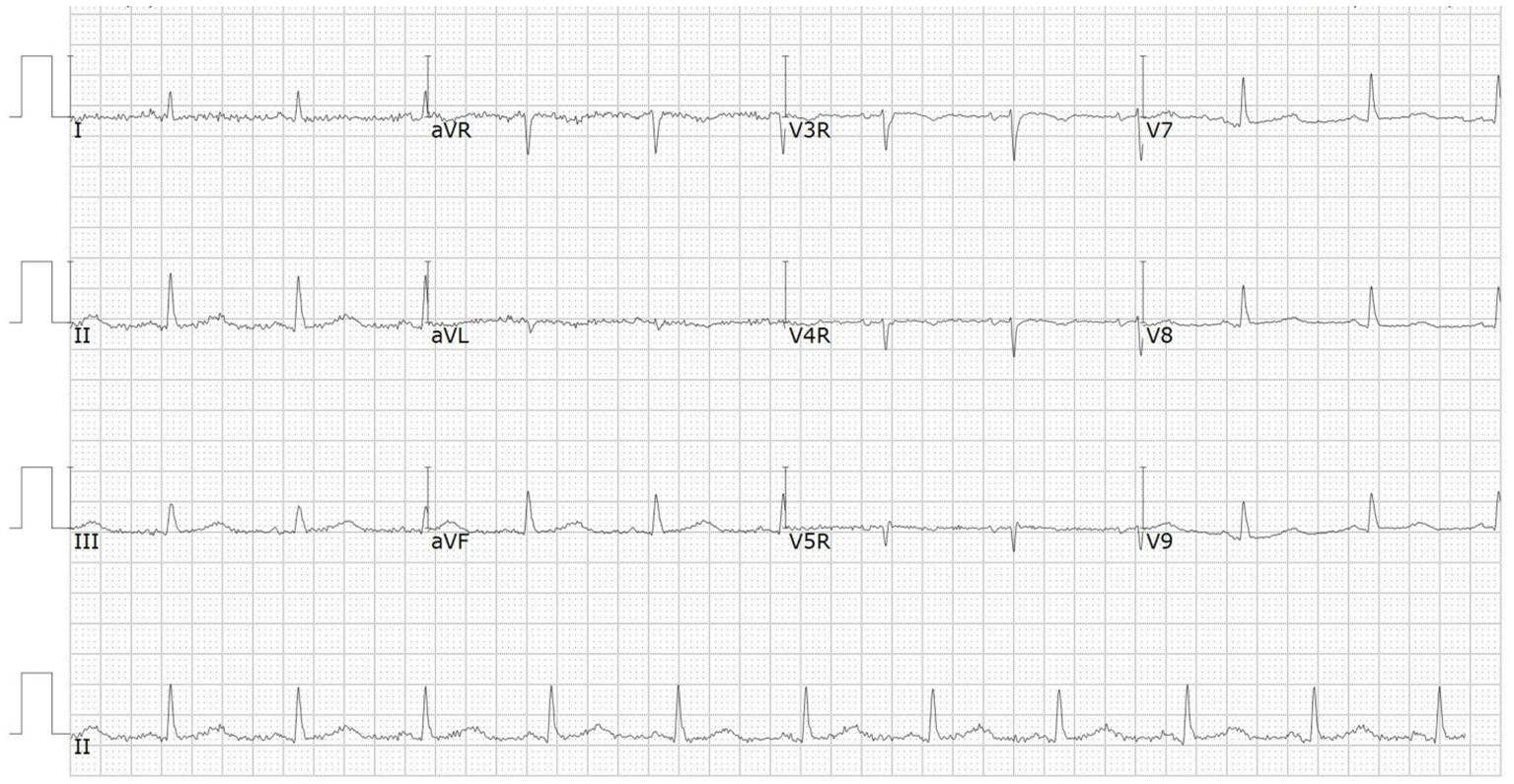 ECG on admission showed ST-segment elevation in leads V7 through V9.