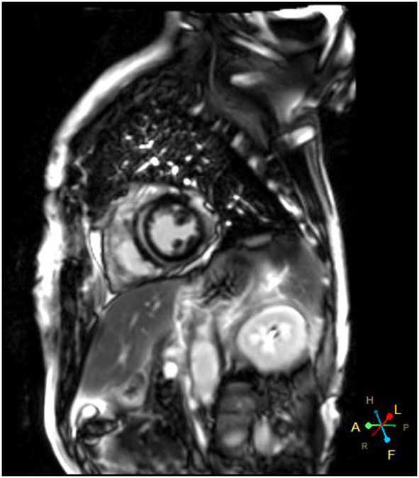Cardiac magnetic resonance showed late gadolinium enhancement in left ventricular wall.