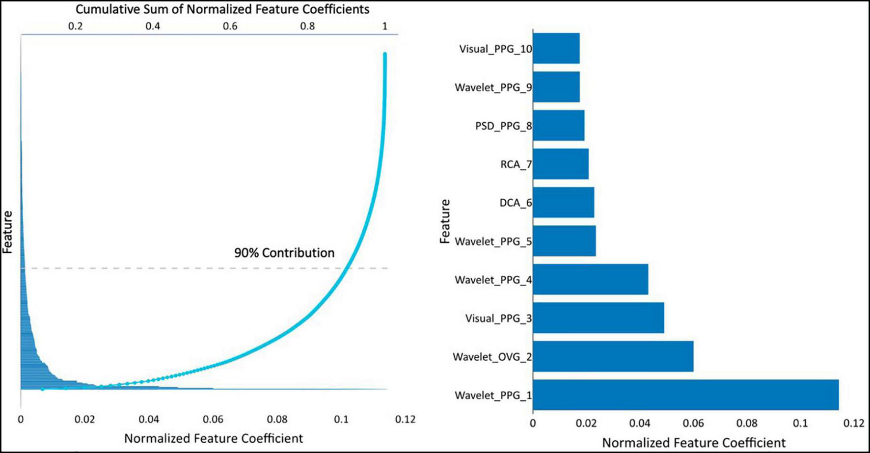 (Left) feature coefficients normalized by feature averages and its cumulative sum, and (right) the normalized feature coefficients for the top 10 features. Visual-PPG — features derived from analyzing the PPG and its first and second derivatives in phase space. Wavelet-PPG — features derived from wavelet analysis of PPG signal. PPG-PSD — features deviates from power spectral density analysis of the PPG signal. RCA, repolarization conduction abnormality; analysis of the ventricular repolarization waveform in band-pass limited frequency ranges. DCA, depolarization conduction abnormality; analysis of the ventricular depolarization waveform in band-pass limited frequency ranges. Wavelet-OVG — features derived from wavelet analysis of OVG signal.