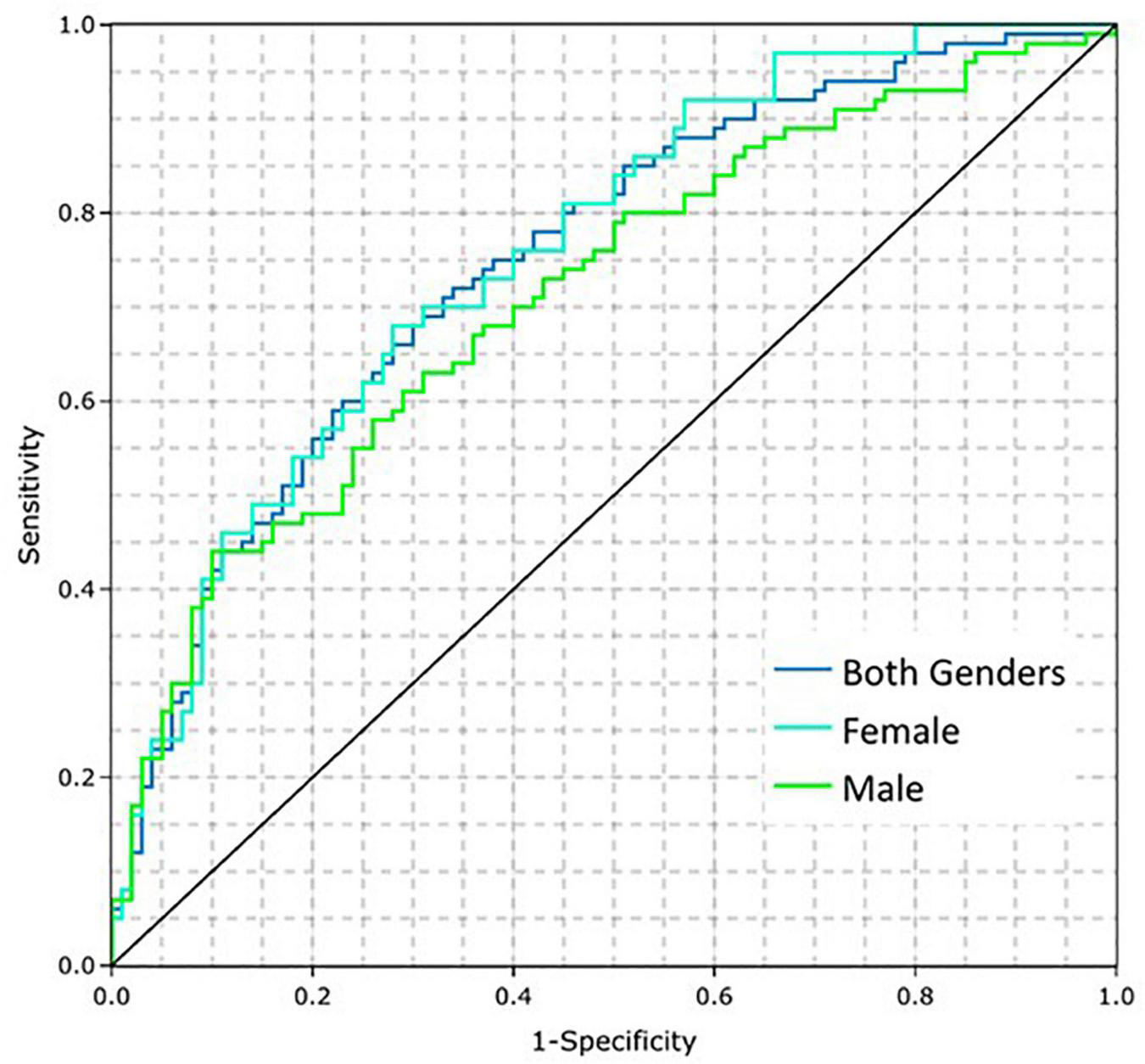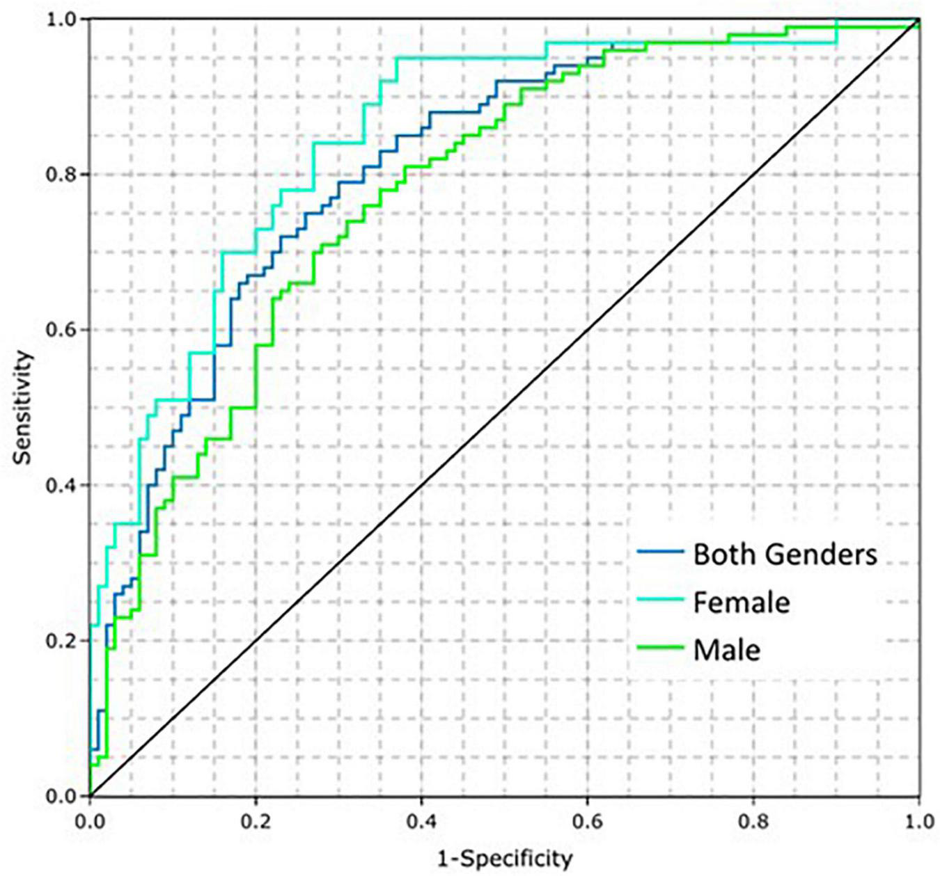 The prevalence of CAD is higher in older patients (16), which can be treated as an estimation of pre-test probability that can be integrated into the CAD Model. Such a modification increases bias toward age, but if the intended population is known, then age can be used to modify the predictions. In the present work, a simple approach is used to account for this effect, which is the multiplication of the predictions by age and dividing by 100 (for normalization purposes). Figure 4 shows the ROC curves for the CAD Model including age for both genders, males, and females, which improved the AUCs to 0.81 (95% CI: 0.77, 0.86), 0.78 (95% CI: 0.71, 0.84), and 0.85 (95% CI: 0.78, 0.92), respectively. When modifying the average model using age, setting the sensitivity to 0.78 using a cut point of 0.32171 resulted in a corresponding specificity of 0.69. This threshold was selected prior to running the clinical validation test set. When implemented for validation, this cut point was normalized to zero.