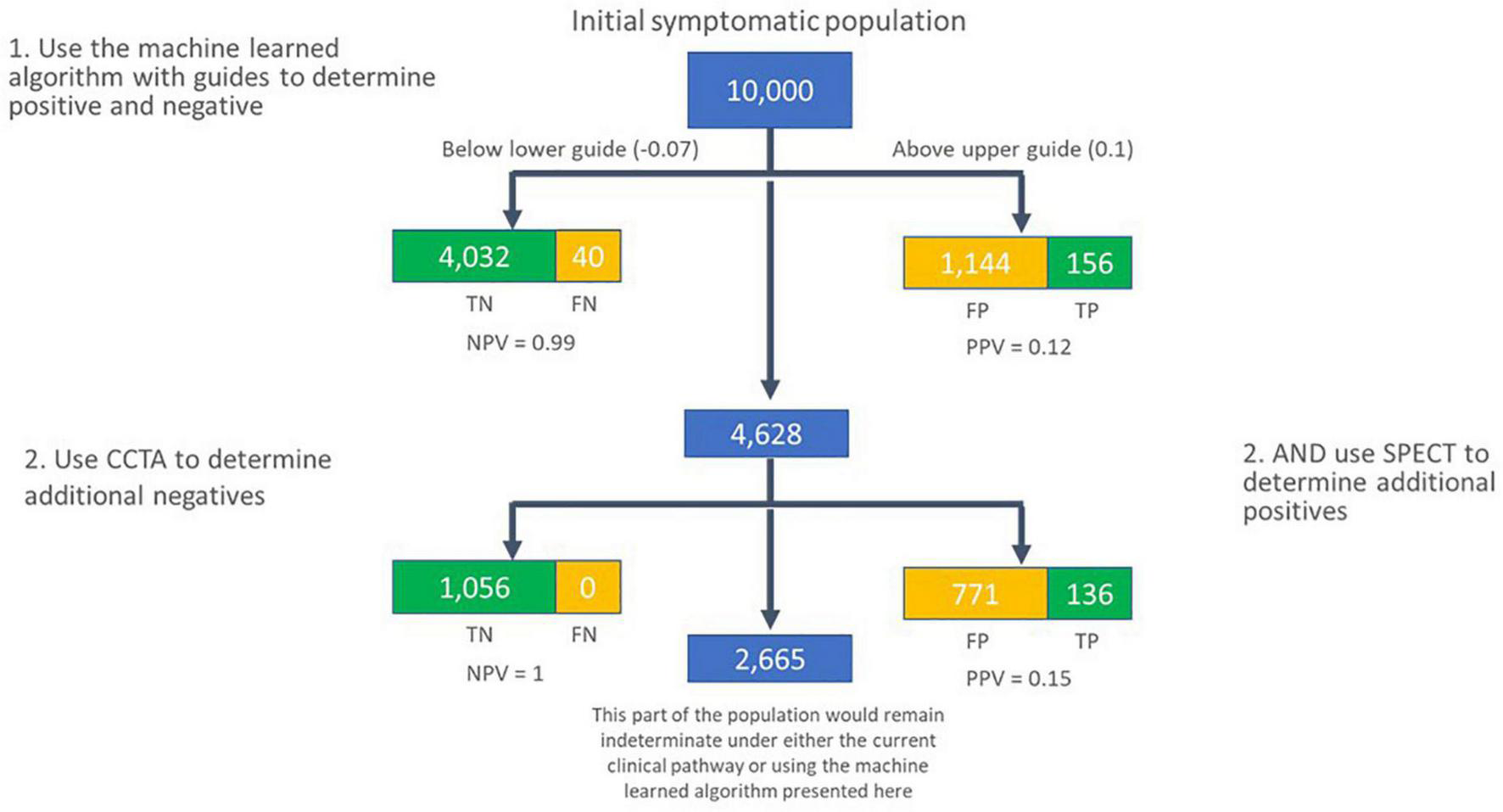 Flow of subjects in a hypothetical population of 10,000 individuals with new onset symptoms of CAD, assuming a pre-test prevalence of 0.04. In the first pass, the machine learned algorithm presented here is used to call individuals as negative for significant CAD if their score is lower than –0.07, and likely positive for functionally significant CAD if their score is greater than 0.1. The group in the middle are secondarily assessed using coronary CTA and SPECT to determine additional subjects that are unlikely to have significant CAD (coronary CTA), or likely to have significant CAD (SPECT). TN, true negative; FN, false negative; TP, true positive; FP, false positive; NPV, negative predictive value; PPV, positive predictive value.
