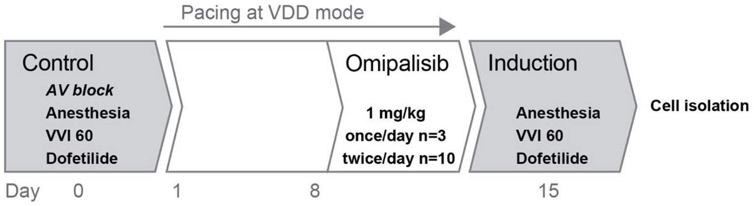 Overview of the experimental protocol. Two experiments were performed in series: control and induction, before and after omipalisib treatment to examine the potential proarrhythmic effect of omipalisib in the AV block dog model.
