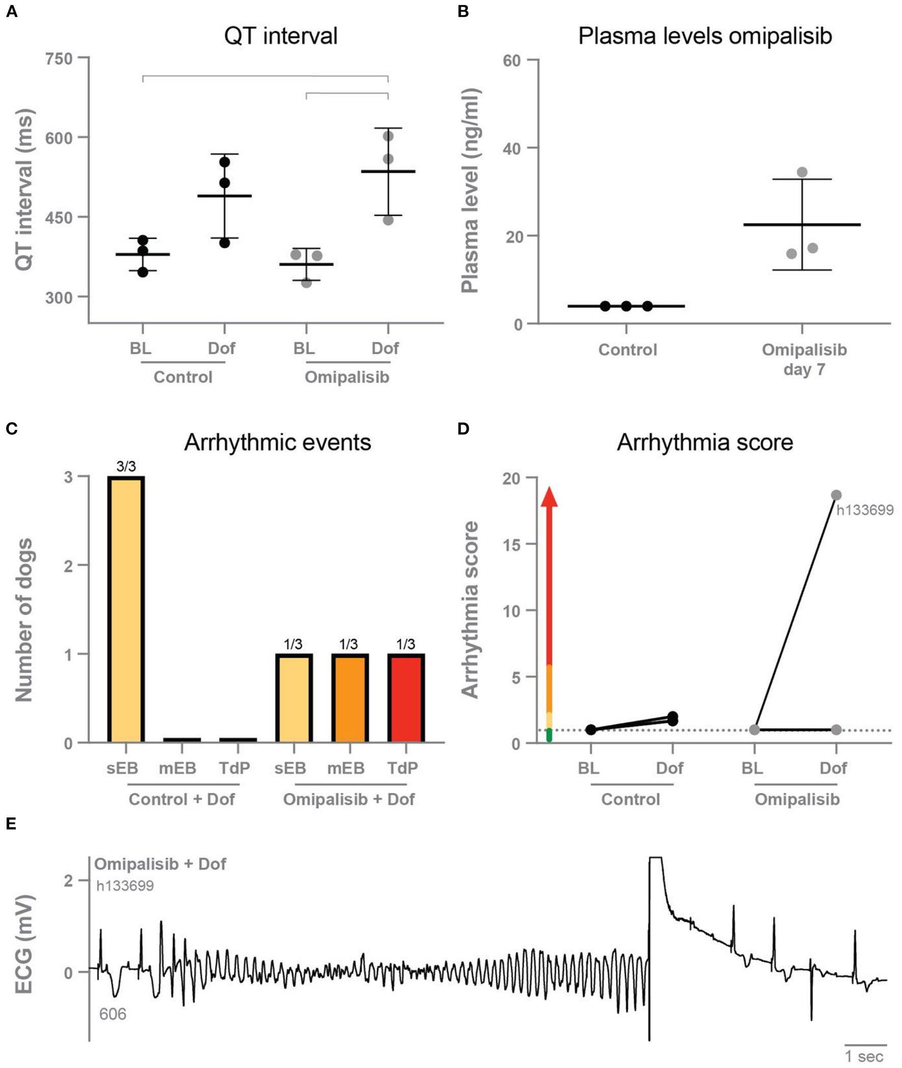 (A) QT interval during baseline and dofetilide before treatment (control) and after omipalisib treatment (1 mg/kg once a day). Repeated measures two-way ANOVA with Tukey's multiple comparisons, bars refer to p < 0.05. (B) Plasma levels of omipalisib before (values <4 ng/ml) and after 7 days of omipalisib treatment. Data are presented as mean ± SD. (C) Incidence of arrhythmic events. (D) Arrhythmia score of dogs before (control) and after 1 mg/kg omipalisib once a day. Single ectopic beats (sEB, scored with 2 points), multiple ectopic beats (mEB, scored with 3–5 points), and Torsade de Pointes (TdP) arrhythmia (scored with 6–49 points). TdP arrhythmia demanding defibrillation was scored with 50, 75 or 100 points depending on the number of shocks. (E) ECG lead II showing a defibrillated TdP arrhythmia after omipalisib treatment and dofetilide infusion in dog h133699. The QT interval (ms) of the complex before the TdP is stated below the T wave.