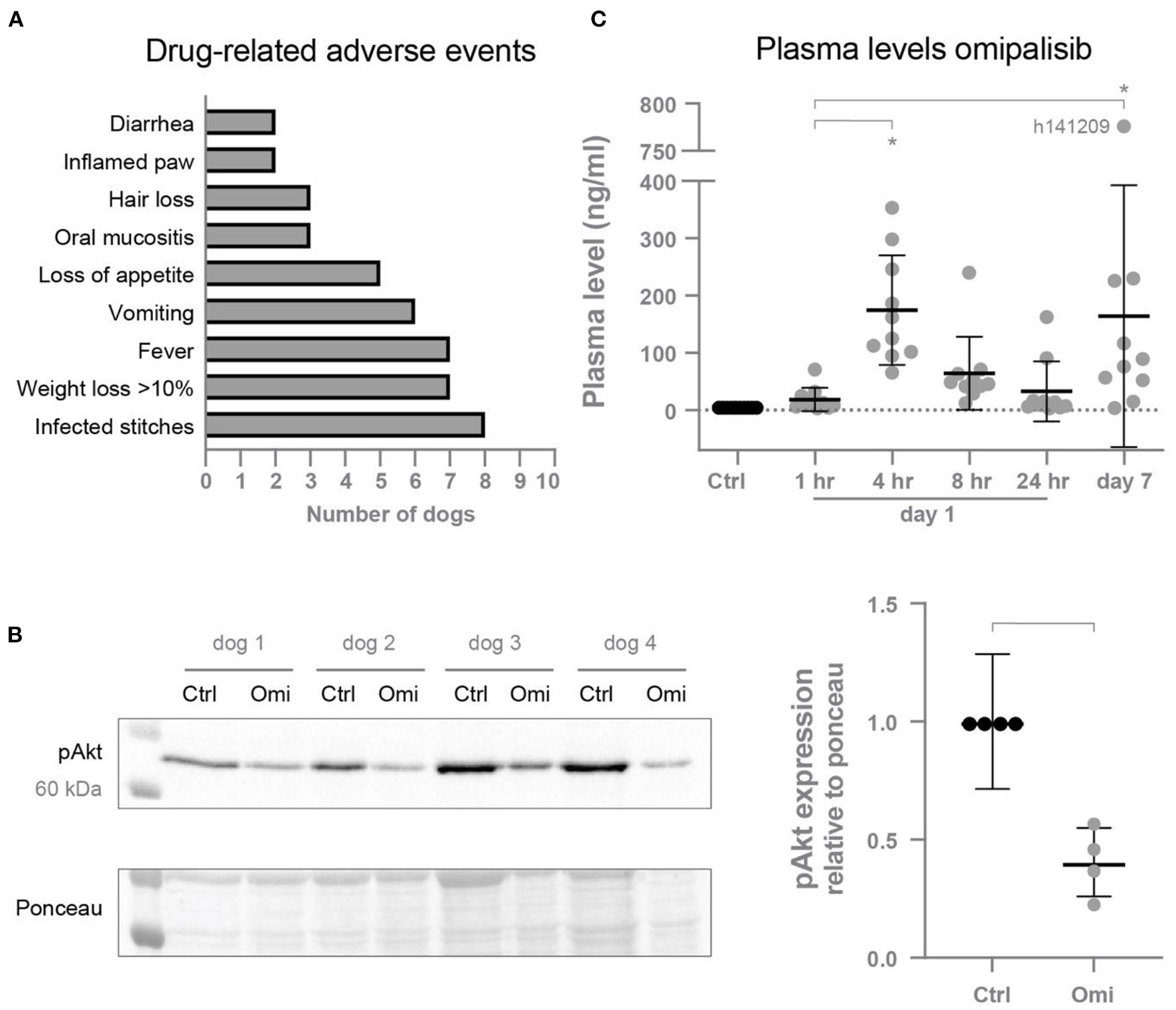 (A) Drug-related adverse events induced by omipalisib. (B) Reduced pAkt protein expression relative to ponceau after omipalisib treatment (Omi) compared to control (Ctrl) measured in cardiac biopsies. Paired t-test, bar refers to p < 0.05. (C) Levels of omipalisib in blood plasma from dogs (n = 10) treated with 1 mg/kg omipalisib twice a day. Repeated measures one-way ANOVA with Tukey's multiple comparisons test, *p < 0.05 compared to Ctrl and for bars. Data are presented as mean ± SD.
