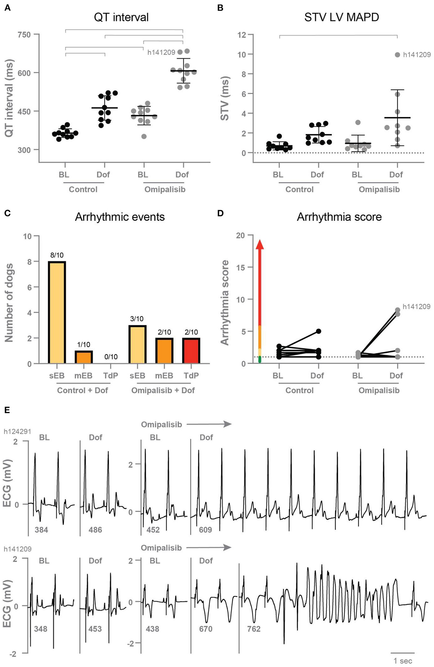 (A) QT interval (n = 10) and (B) short term variability of repolarization (STV LV MAPD, n = 9) in dogs before (Control) and after 1 mg/kg omipalisib twice a day during baseline (BL) and dofetilide (Dof). Data are presented as mean ± SD. Repeated measures two-way ANOVA with Tukey's multiple comparisons test, bars refer to p < 0.05. (C) Incidence of arrhythmic events and (D) arrhythmia score during 10 min after start of Dof before and after omipalisib treatment. Single ectopic beats (sEB, score: 2 points), multiple ectopic beats (mEB, scored with 3–5 points), and Torsade de Pointes (TdP) arrhythmia (scored with 6–49 points). TdP arrhythmia demanding defibrillation were scored with 50, 75 or 100 points depending on the number of shocks. (E) ECG lead II of the two dogs: h124291 with arrhythmia score of 1, and h141209 with a self-terminating TdP arrhythmia and arrhythmia score of 8.3.