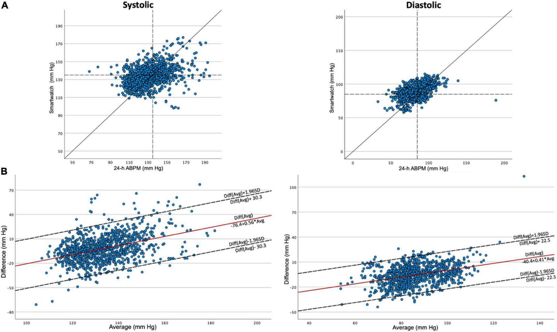 Bland-Altman plots were constructed and bias and limits of agreement were calculated. In the Bland-Altman plots difference is calculated as ABPM minus smartwatch measurements. However, as recently described by Taffé et al., the Bland-Altman method has certain limitations when comparing a new measurement method with a reference method (15). Also, the group of Bland and Altman has recently confirmed that the Bland-Altman method was never intended for calibration of a new device to a gold standard reference method (16). Taffé et al. therefore describe a new method for measuring bias and precision of new measuring devices, which is called the Taffé method. This method was used to calculate bias and precision. The Taffé method was carried out using R statistical software package MethodCompare. As current BP validation standards, as provided by the Association for Advancement of Medical Instrumentation (AAMI) and the European Society for Hypertension (ESH) (17, 18), rely on measures of the original Bland-Altman methodology, both the Bland-Altman and Taffé methods will be reported. While the nature of this study implies that the methodology for non-invasive sphygmomanometers (ISO 81060-2:2018) cannot be fully followed, reference criteria will be used to evaluate the results of this study. For the Bland-Altman analyses, all coupled smartwatch and ABPM measurements were used. For the Taffé method, all measurements for both devices were used as recommended by the authors.