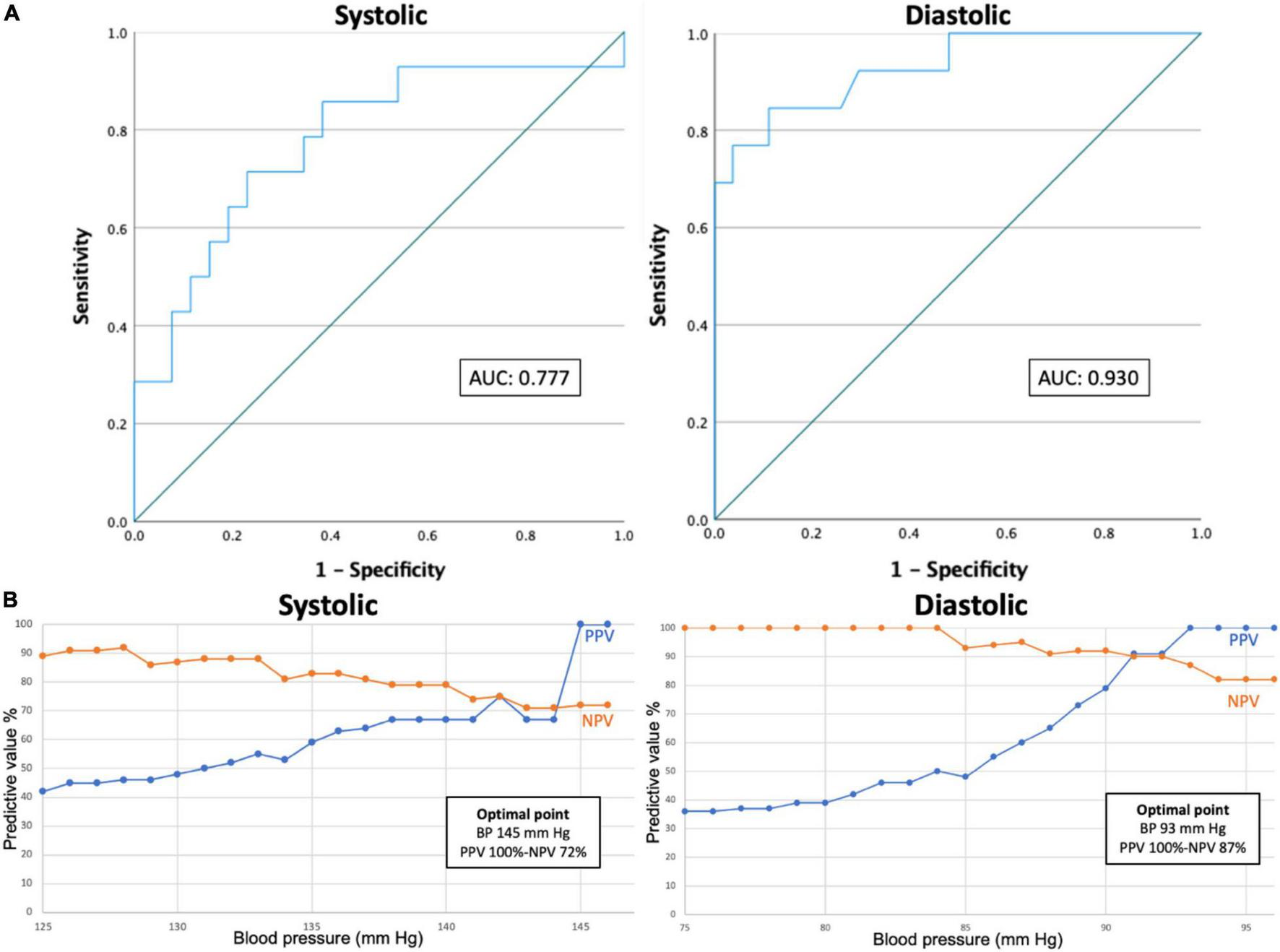 Positive predictive value and NPV optimization curves were constructed. To obtain these curves, PPV and NPV were calculated for each cut-off ranging from 125 to 146 mmHg systolic and 75 to 96 mmHg diastolic. The optimal point was calculated as the point on which the sum of PPV and NPV was highest. For systolic BP, the optimal point was at 145 mmHg with a PPV and NPV of 100 and 72%, respectively. The highest NPV was obtained at 128 mmHg with a PPV and NPV of 46 and 92%, respectively. For diastolic BP, the optimal point was at 93 mmHg with a PPV and NPV of 100 and 87%, respectively. The highest NPV was reached at 84 mmHg with a PPV and NPV of 50 and 100%, respectively. The highest PPV was reached at 93 mmHg with a PPV and NPV of 100 and 87%, respectively.