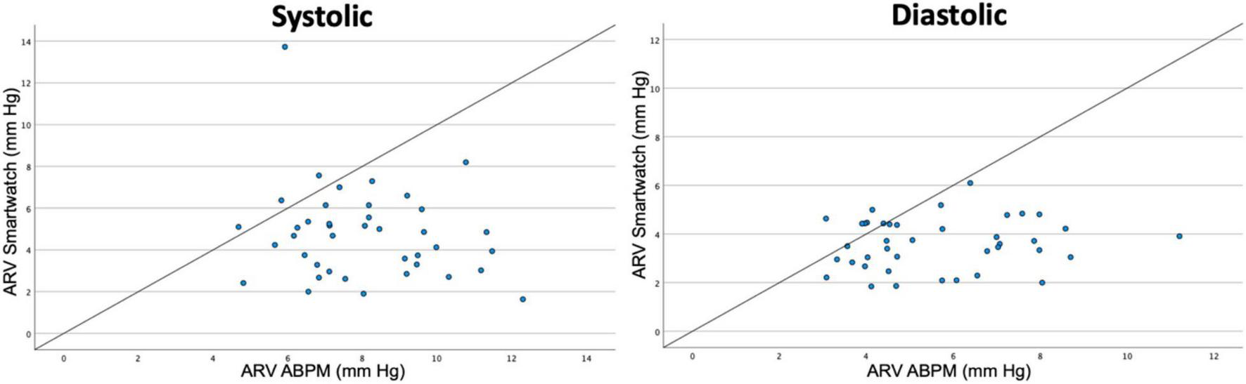 Blood pressure variability is depicted as daytime SD (SDday), SDw and daytime ARV (ARVday) in Table 3. The results indicate that BP variability is higher in the ABPM measurements as compared to the smartwatch measurements. Paired sample t-tests for SDday and ARVday demonstrate a significant difference between BP variability of the ABPM versus the smartwatch measurements. Scatterplots of daytime ARV-values per patient are depicted in Figure 4, demonstrating a systematically higher BP variability in the ABPM measurements as compared to the smartwatch measurements. Furthermore, the CV was calculated. For SBP the CV was 3.6% ± 1.7% for the smartwatch and 11.4% ± 3.1% for the ABPM, p < 0.01; for DBP the CV was 4.2% ± 1.1% for the smartwatch as compared to 13.1% ± 3.8% for the ABPM device, p < 0.01, again confirming a significantly lower BP variability in the smartwatch measurements.
